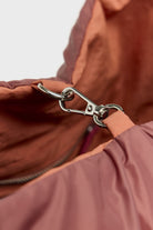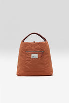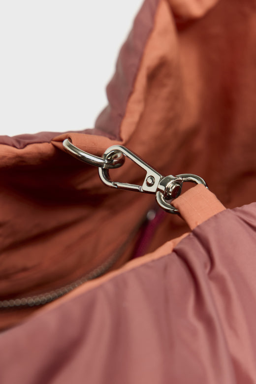 Reversible quilted shoulder bag in terracotta tones with rope handles, tonal removable strap, and embroidered “blr” logo. One side in quilted dark terracotta, the other in terracotta ripstop.