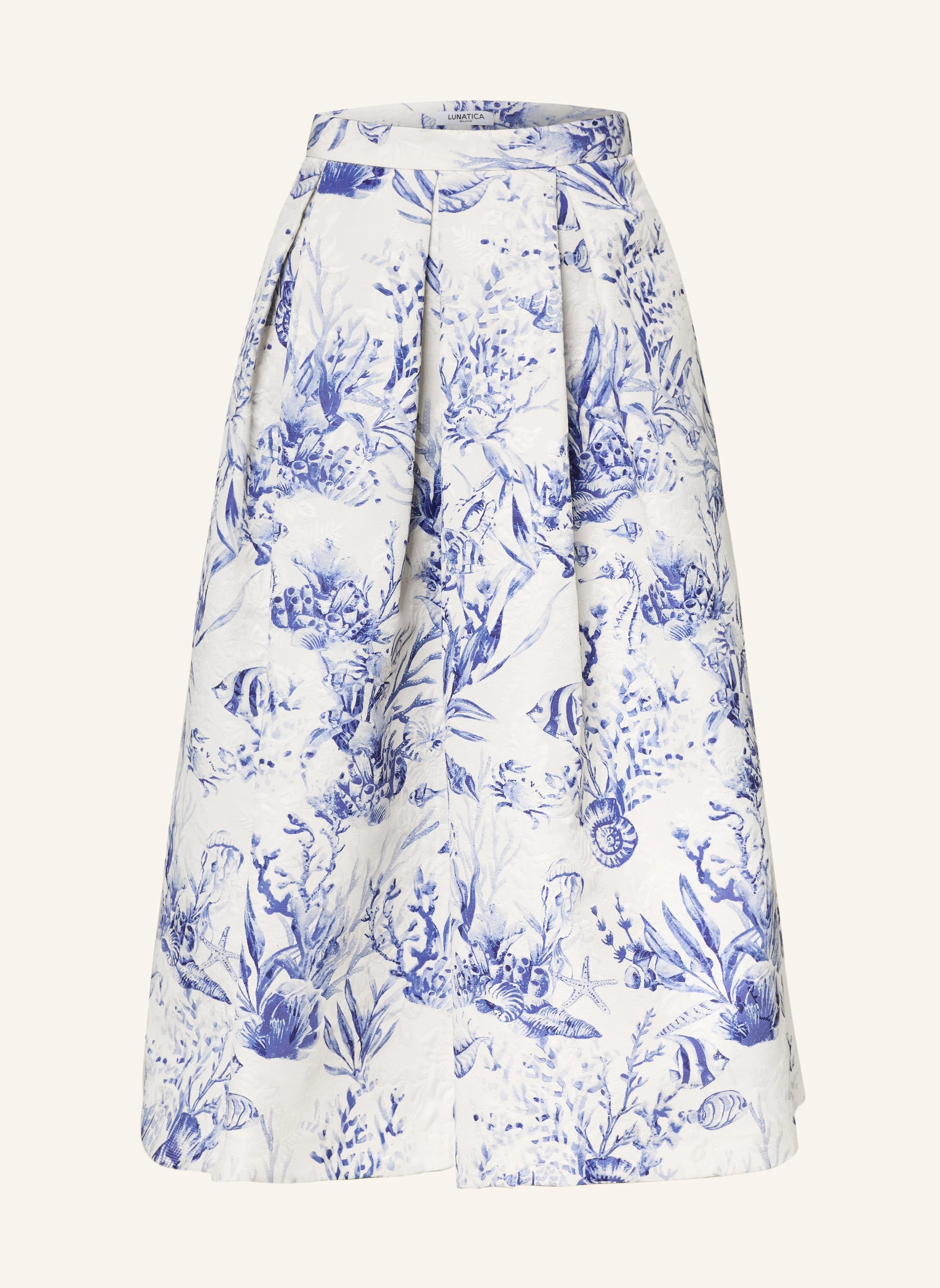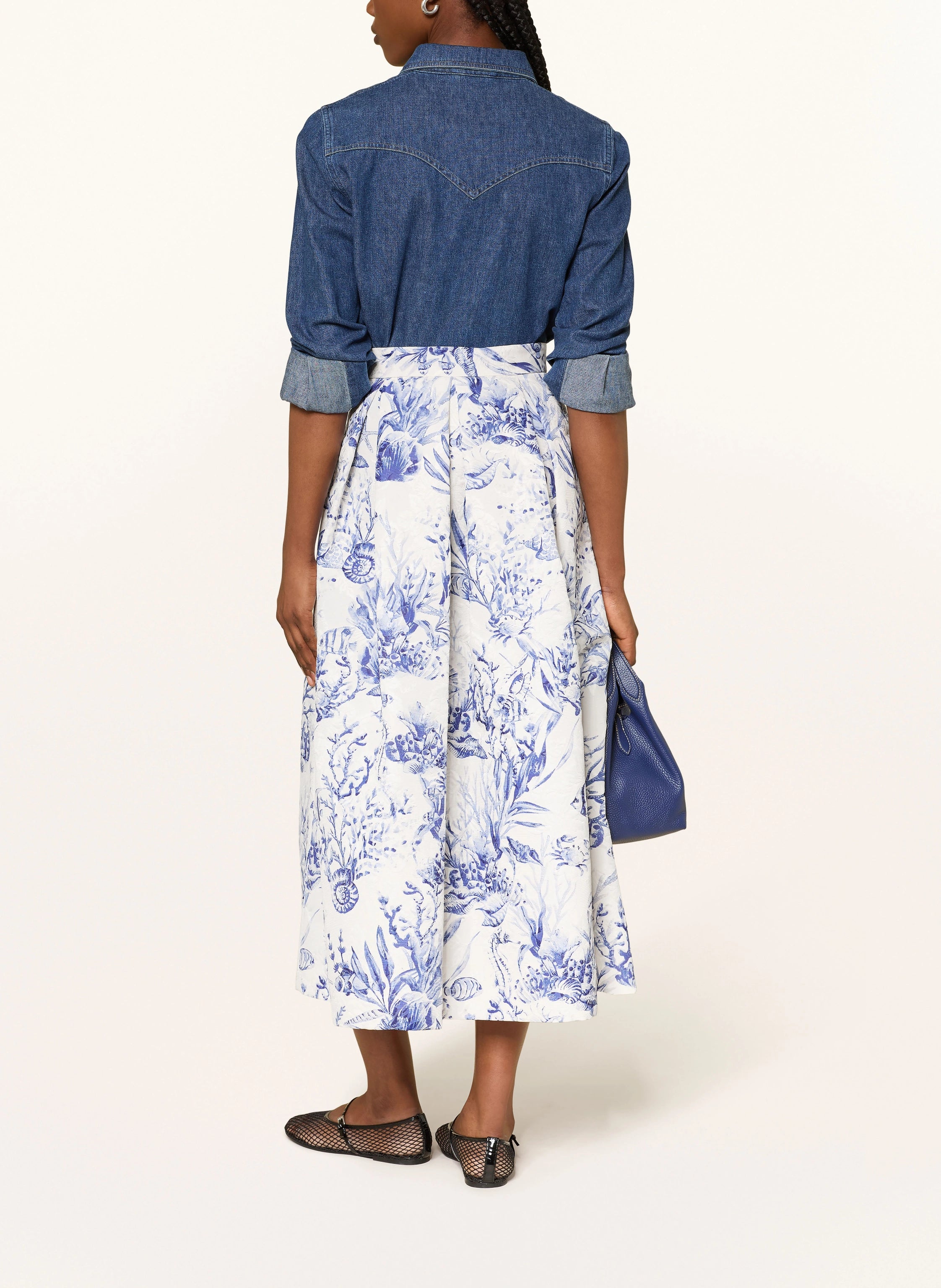 The standout feature of this piece is its all-over print, woven directly into the fabric using traditional jacquard techniques rather than simply printed on the surface. The pleating works in harmony with the flared cut to create a graceful, structured volume that moves beautifully as you walk.