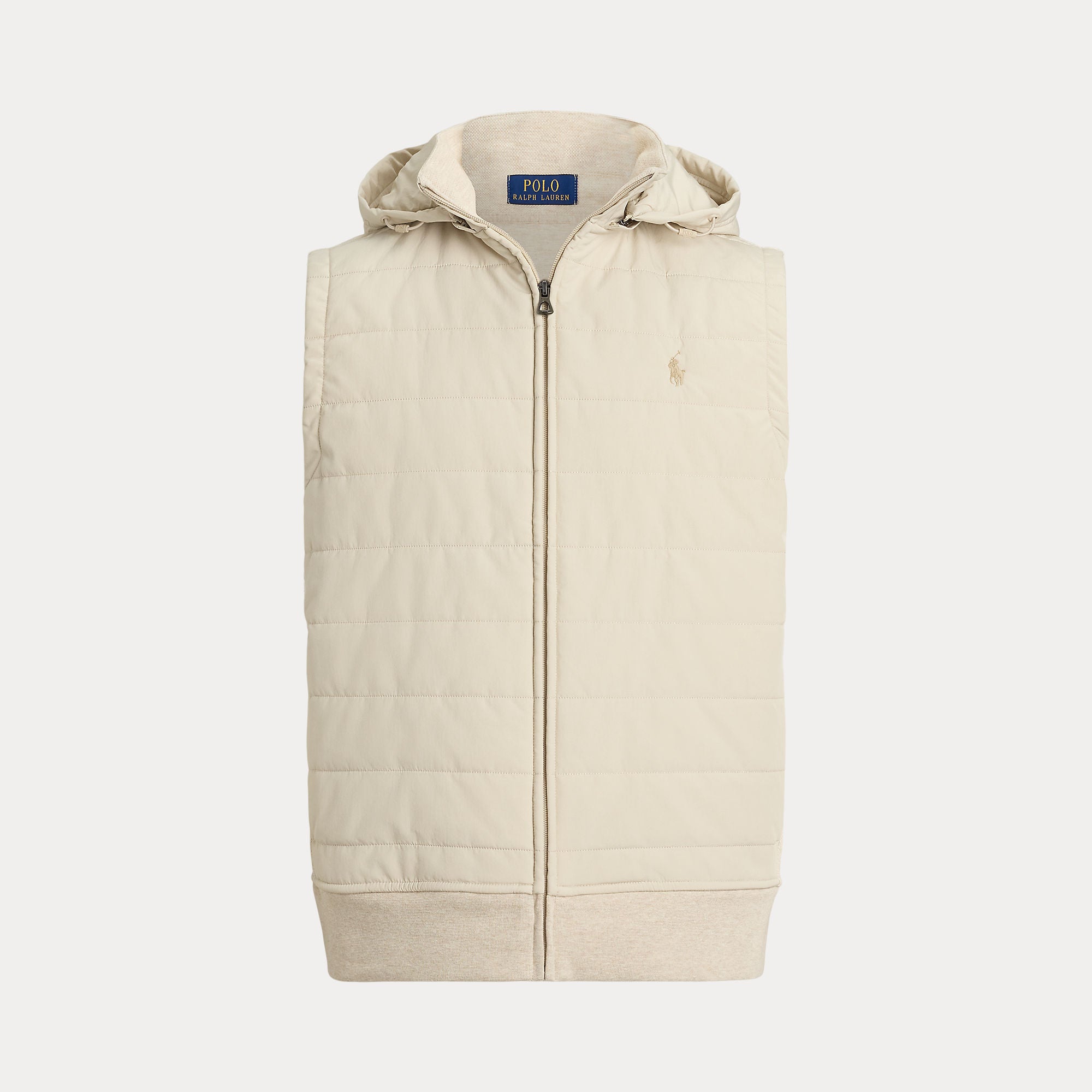 This cotton-blend vest contrasts a mesh-textured version of Polo’s double-knit fabric with quilted paneling. A zip-off hood coupled with down-alternative insulation make it a warm and versatile layering piece.