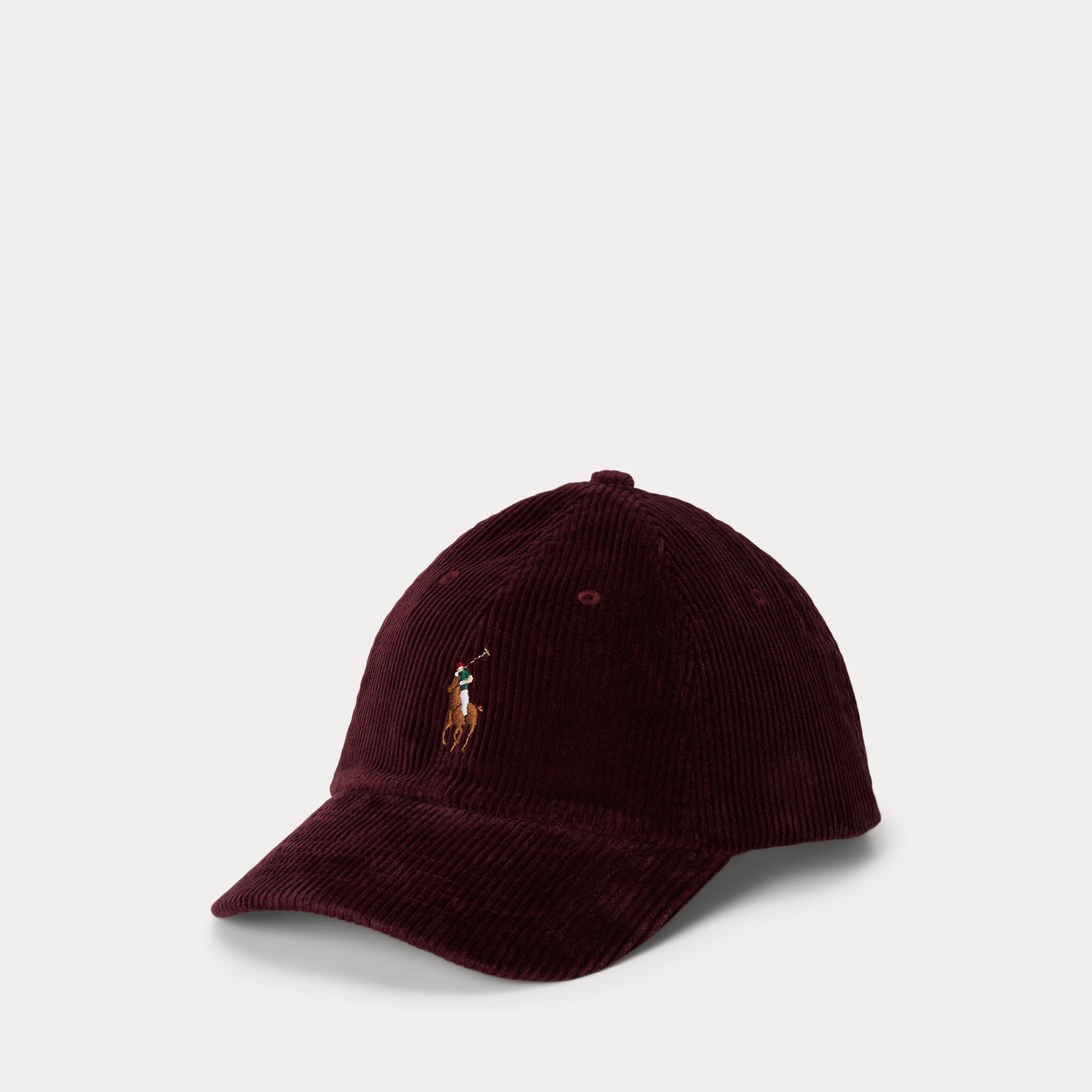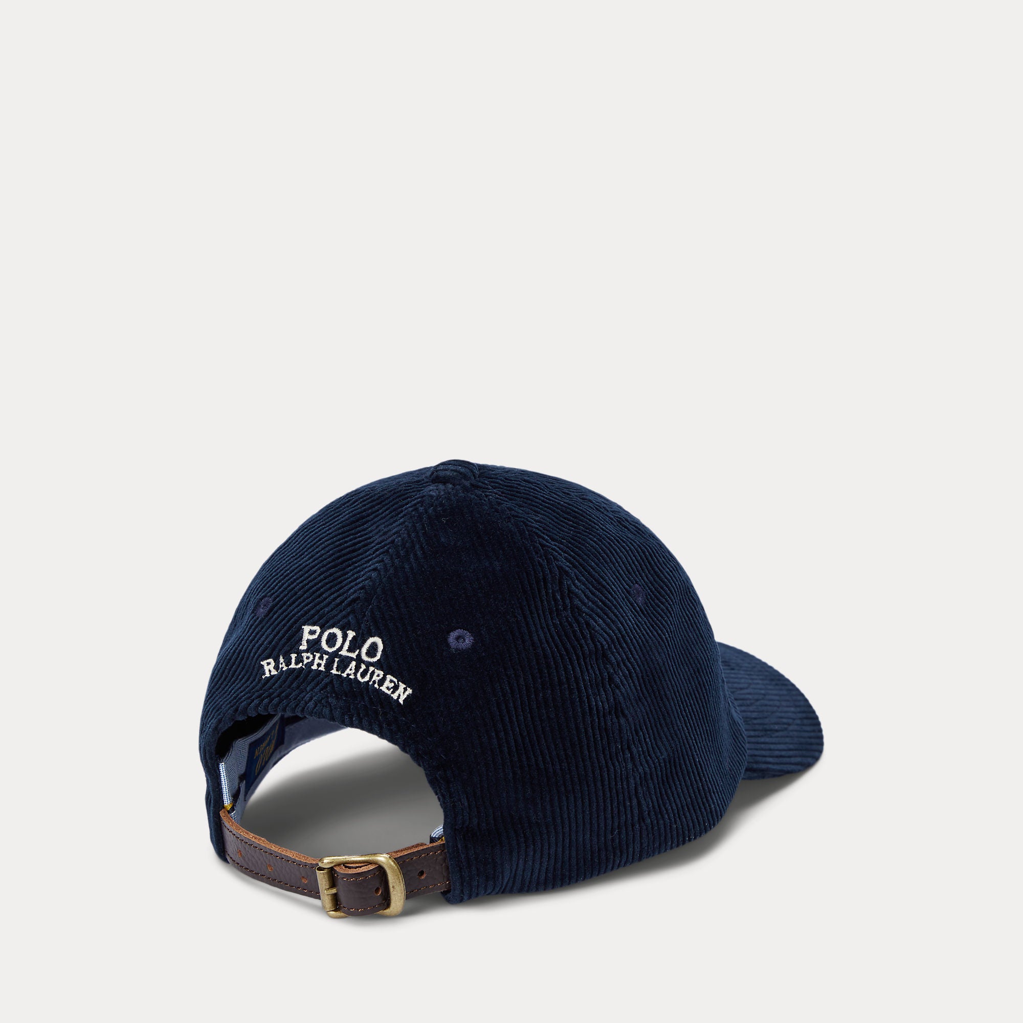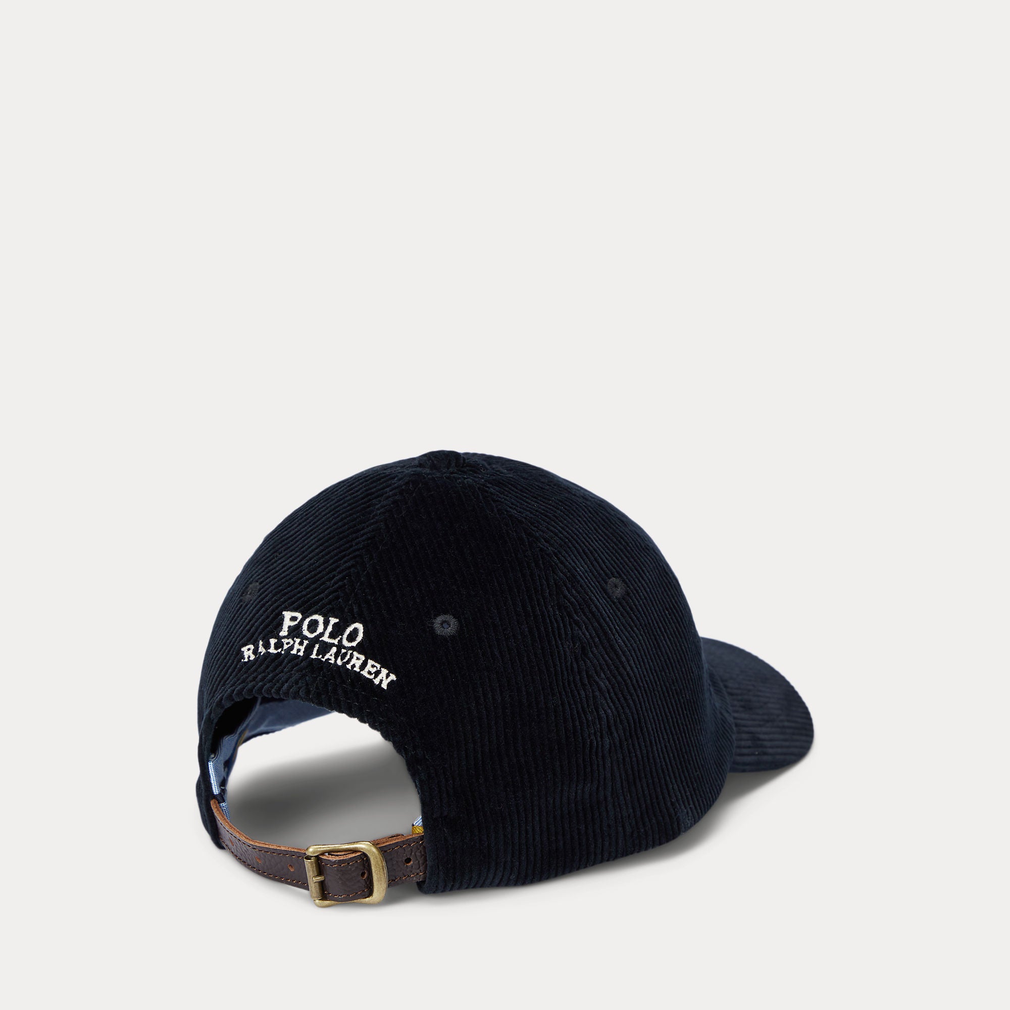 Ralph Lauren’s multicolored signature embroidered Pony accents this corduroy ball cap, which is finished with a buckled leather strap at the back.
