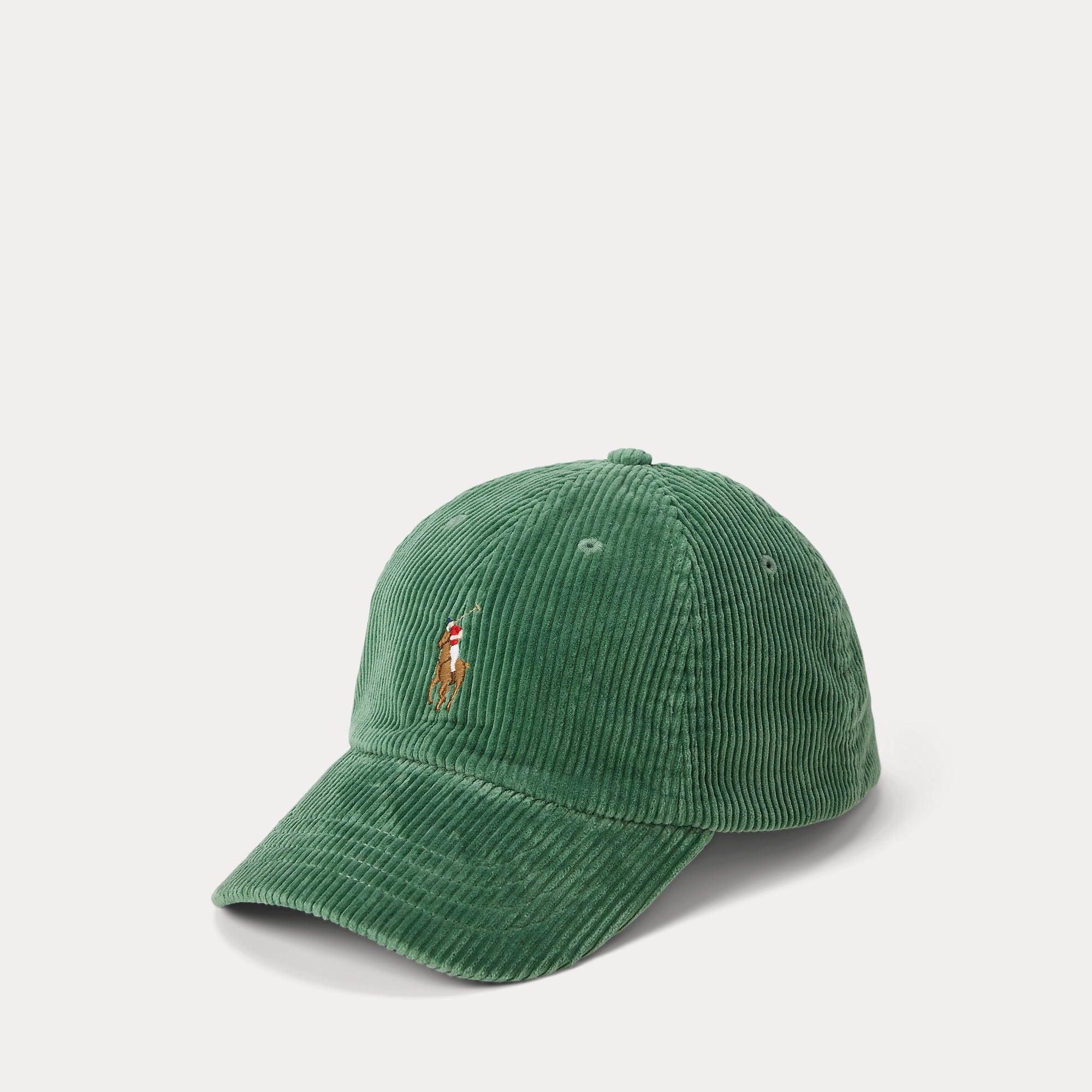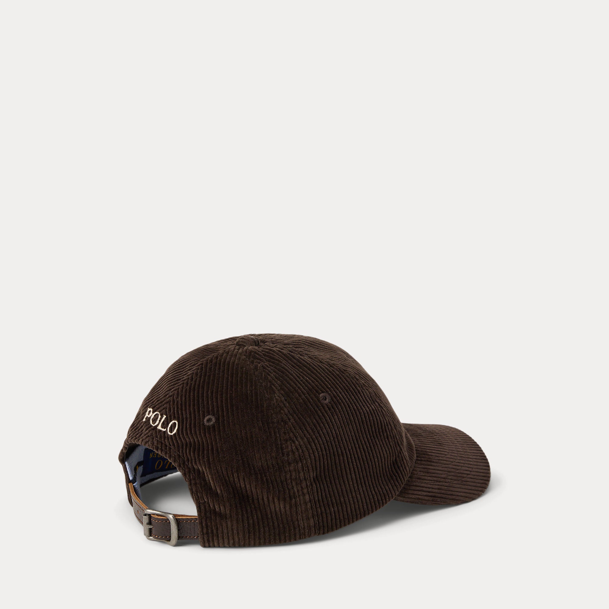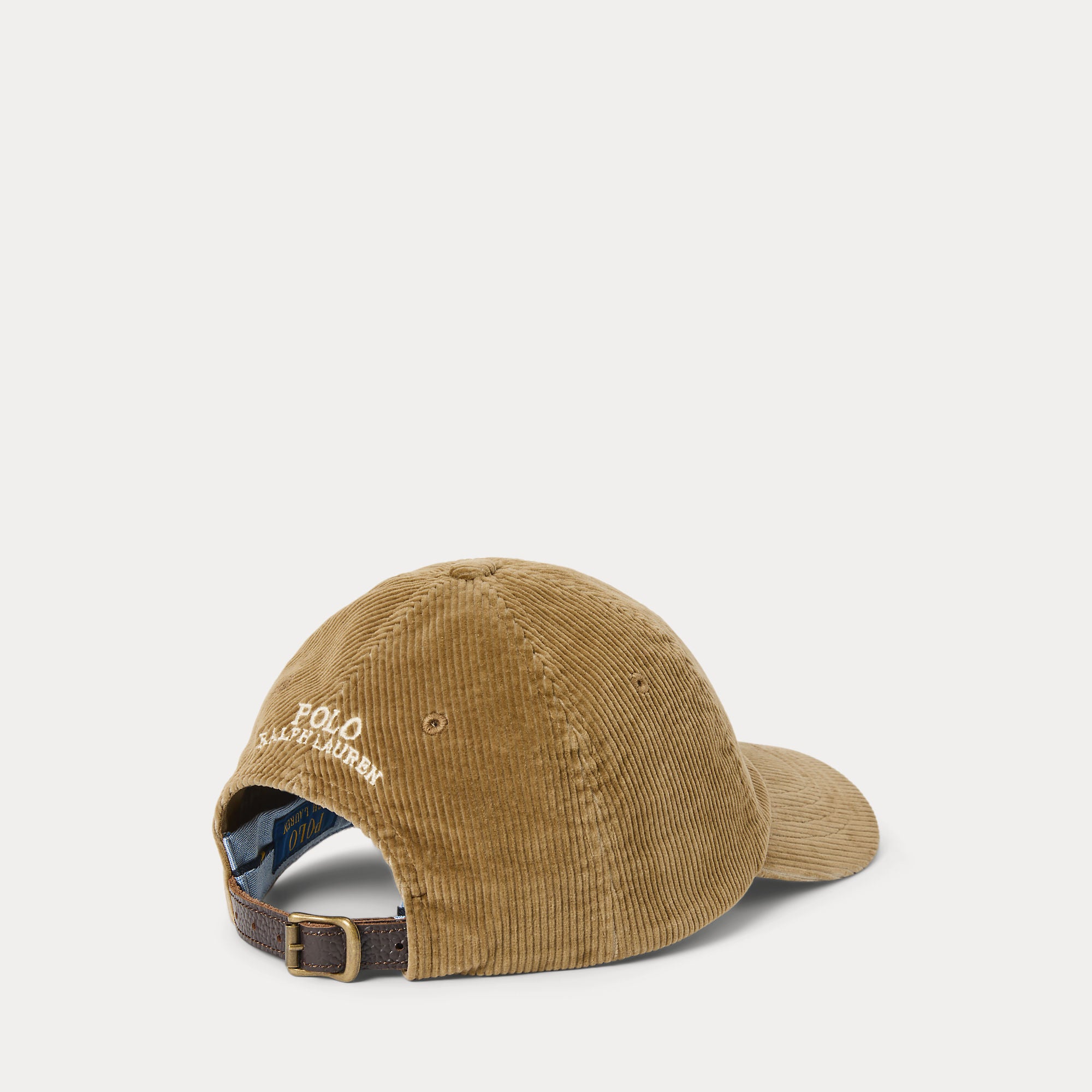 Ralph Lauren’s multicolored signature embroidered Pony accents this corduroy ball cap, which is finished with a buckled leather strap at the back.