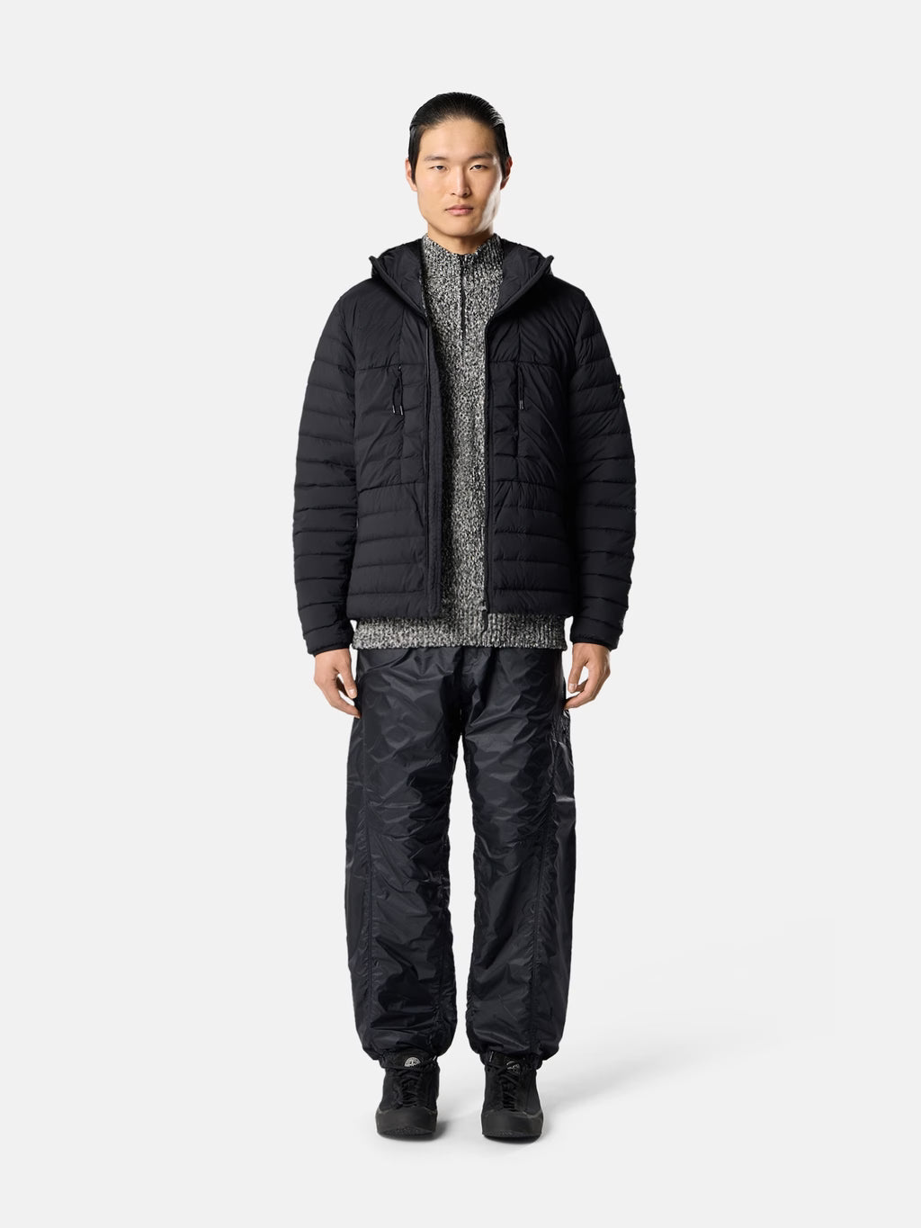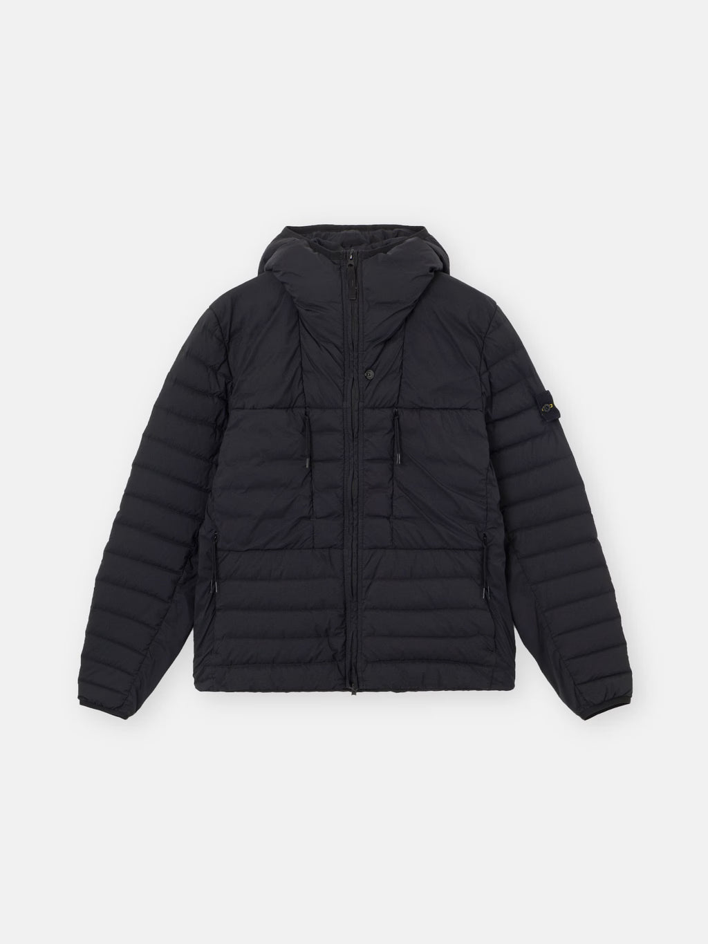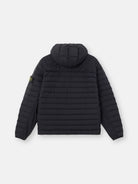 Hooded down jacket in a single layer of light stretch nylon with seamless tunnels for improved feather hold, featuring zip pockets, elasticated cuffs, and a two-way zip. Garment dyed with anti-drop.
