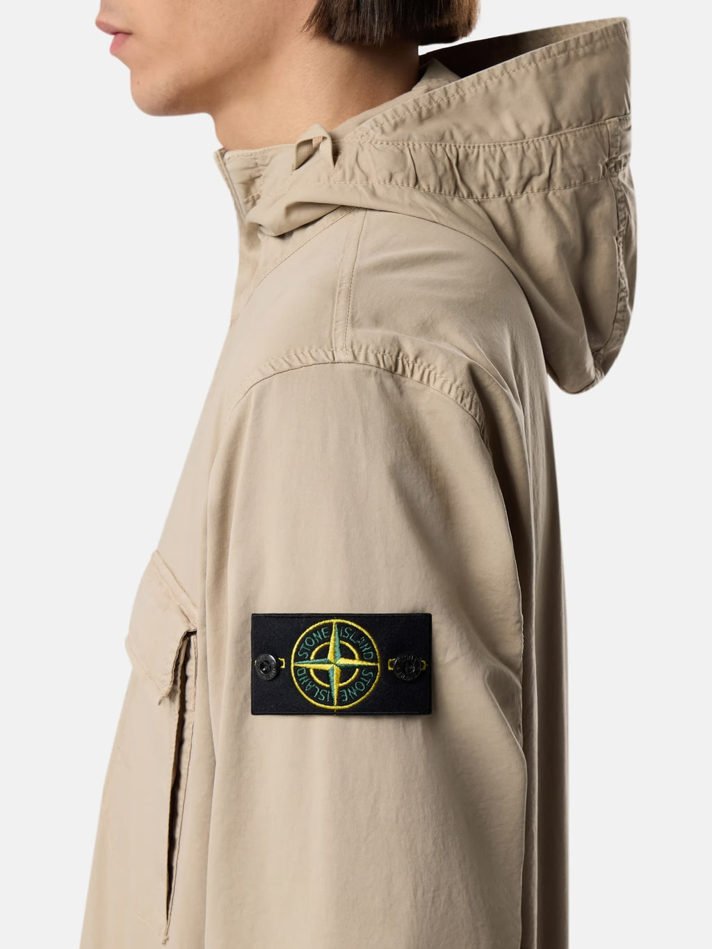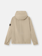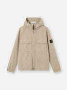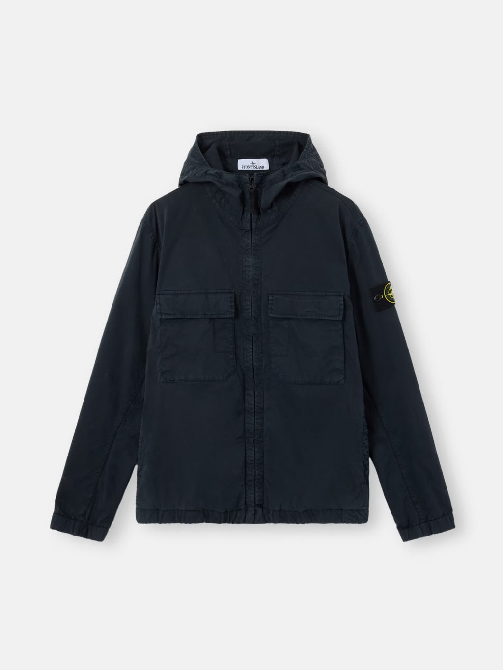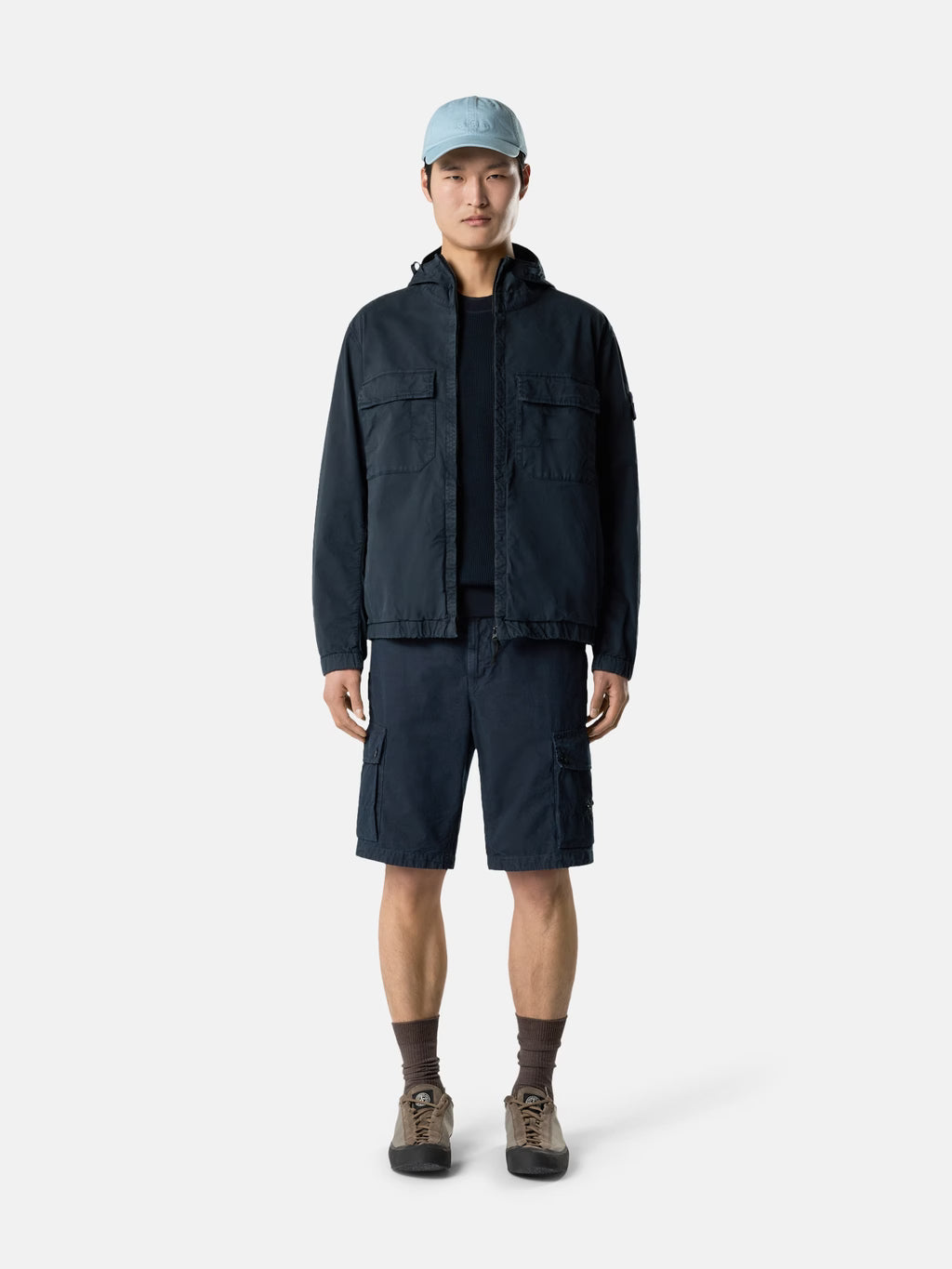 Hooded jacket in stretch organic cotton twill featuring dual-compartment chest pockets, hand pockets, elasticated trims, and concealed high-neck zip. Garment dyed with anti-drop.