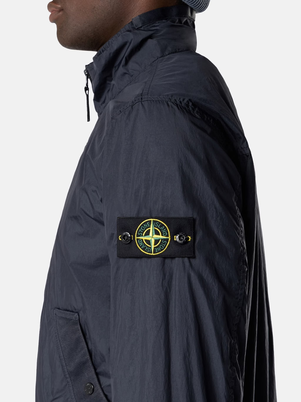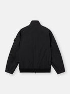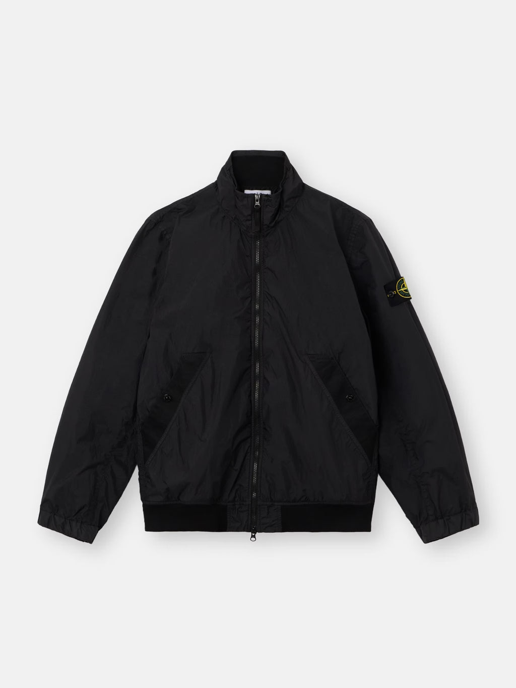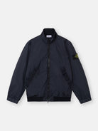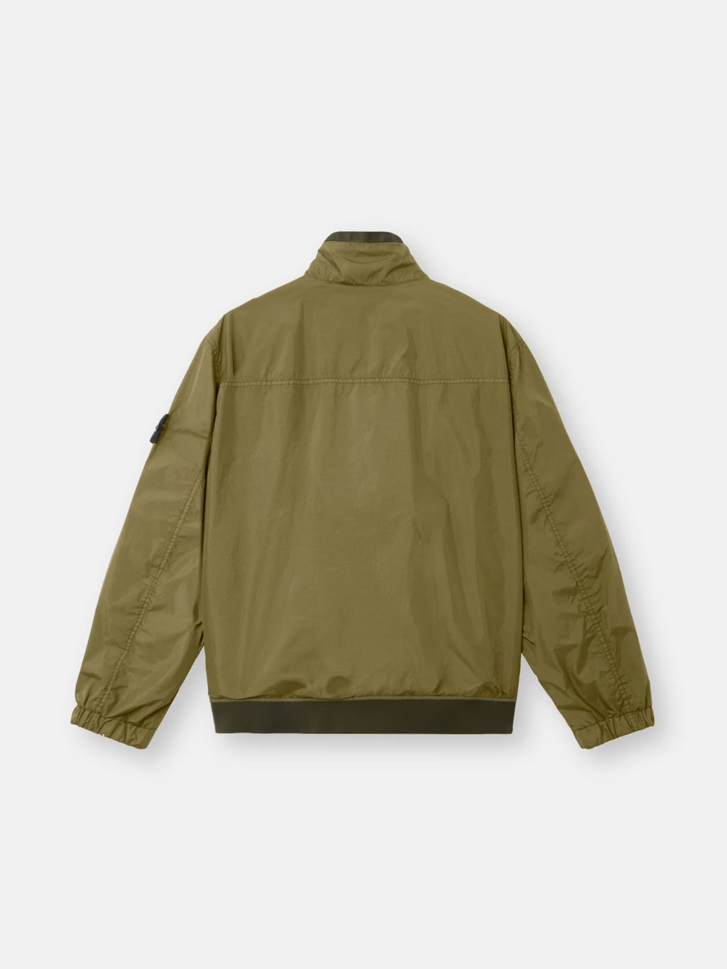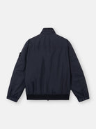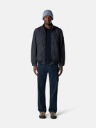 Stand collar jacket in light recycled nylon rep with a crinkled appearance, featuring snap-fastened pockets, elasticated cuffs, and a two-way zip. Garment dyed with anti-drop.