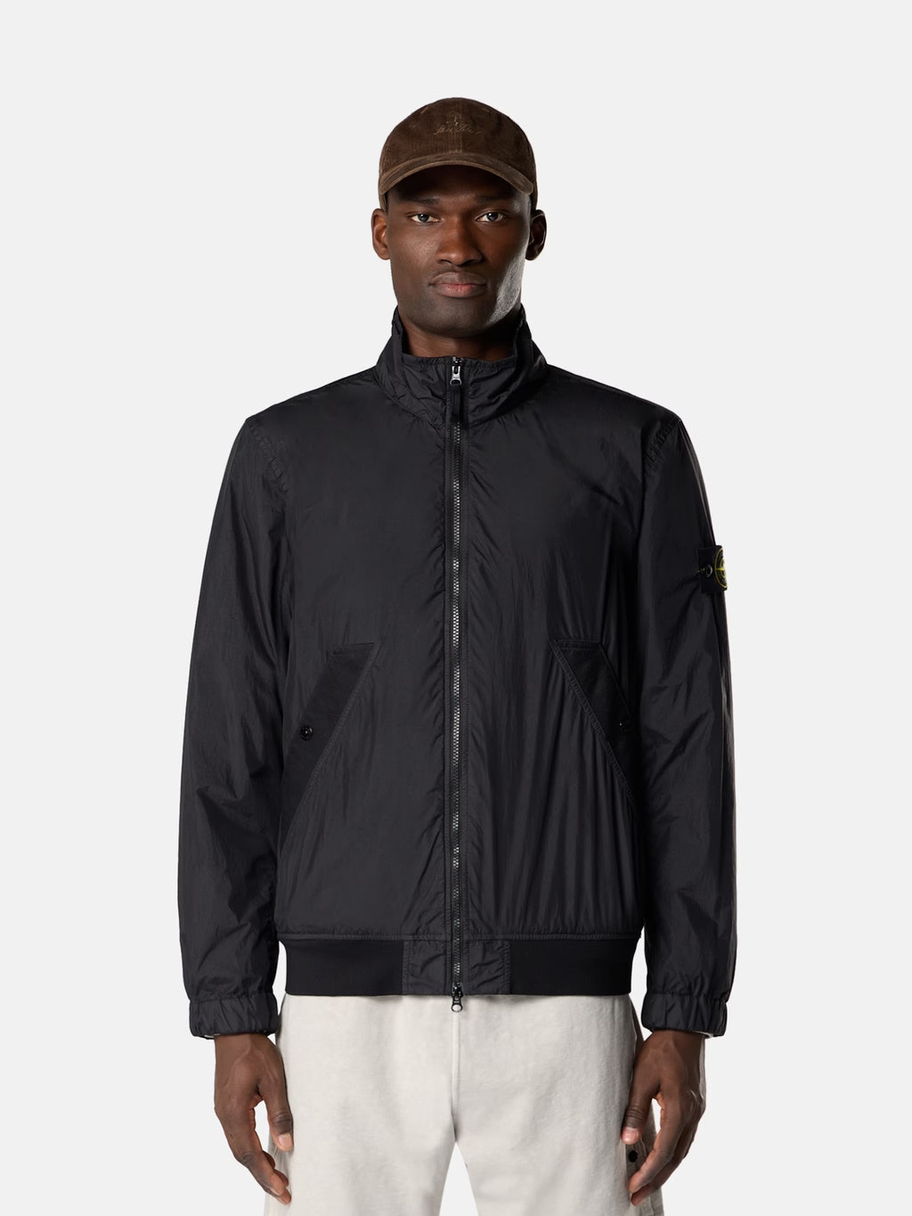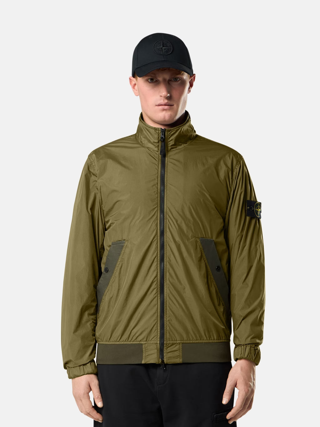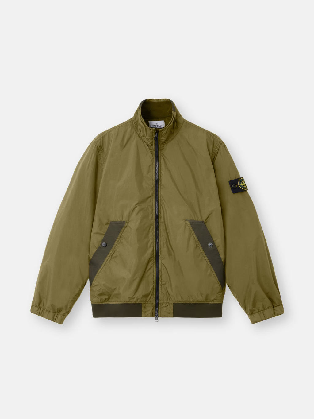 Stand collar jacket in light recycled nylon rep with a crinkled appearance, featuring snap-fastened pockets, elasticated cuffs, and a two-way zip. Garment dyed with anti-drop.