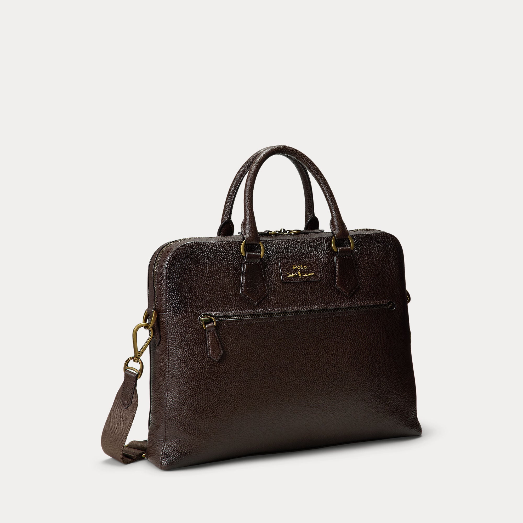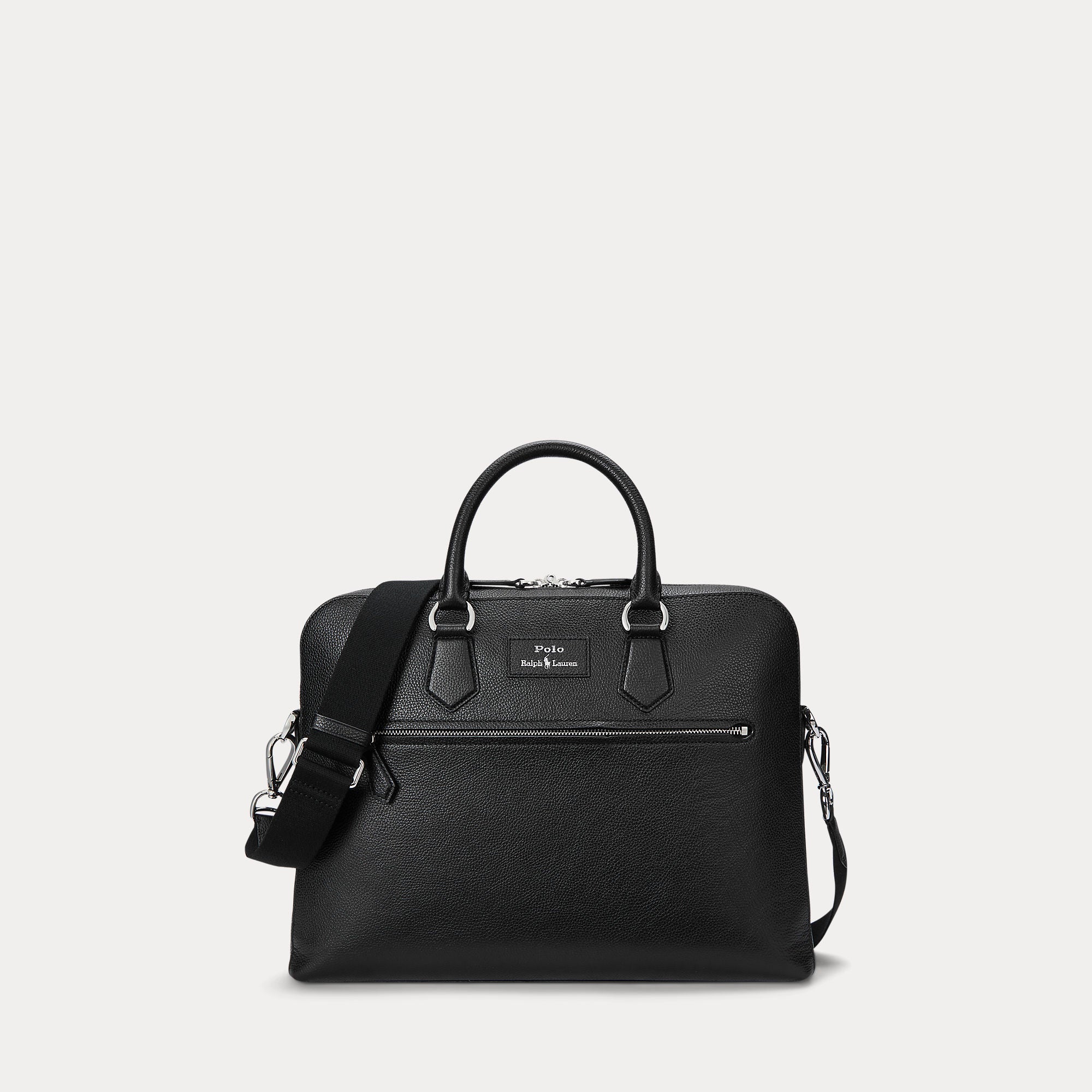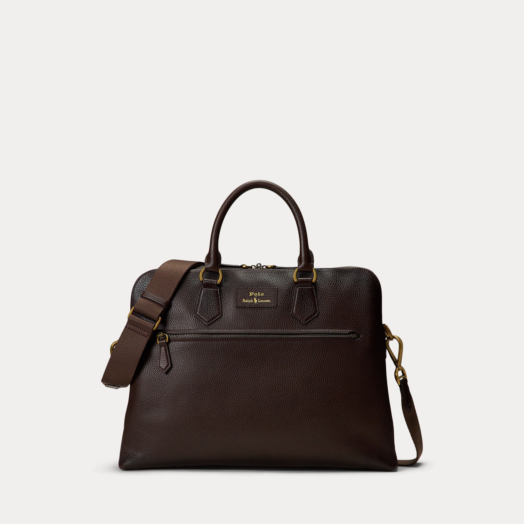 Two leather top handles, each with a 4.25" drop. Removable, adjustable leather-trimmed webbed shoulder strap.Two-way top zip closure with leather zipper pulls.Front zip pocket. Interior padded laptop sleeve with additional zip pocket. Interior slip pockets.“Polo Ralph Lauren” and signature Pony embossed at the front.Reinforced base.Lined with cotton twill.12.25" H x 15.25" L x 2.25" D.Shell: leather. Lining: cotton.Comes with a signature dust bag.