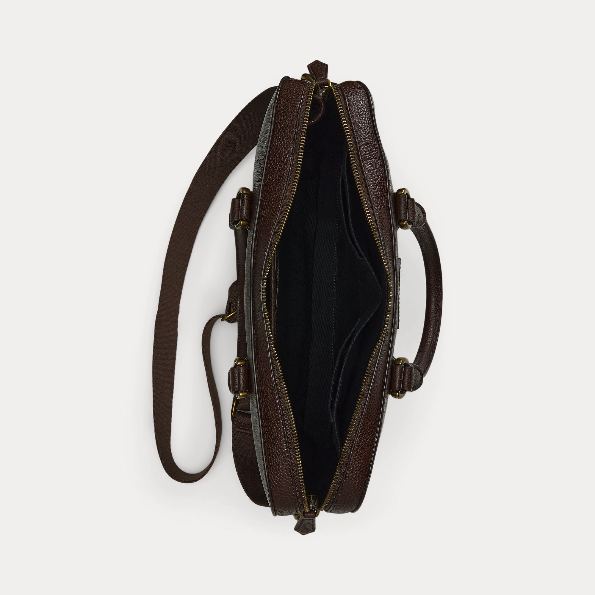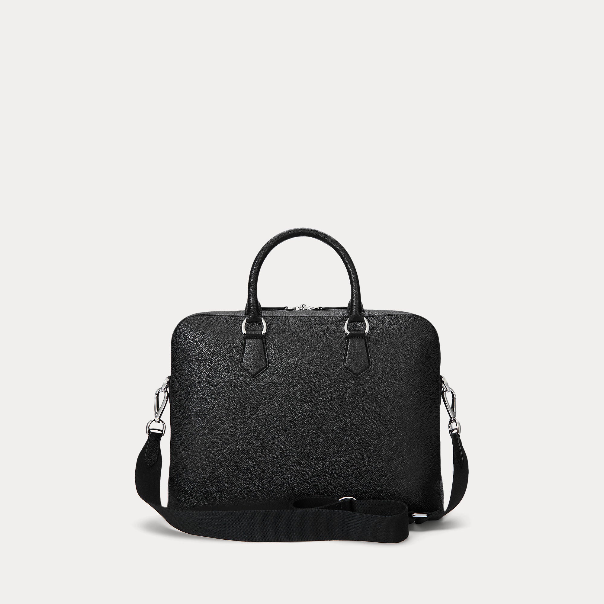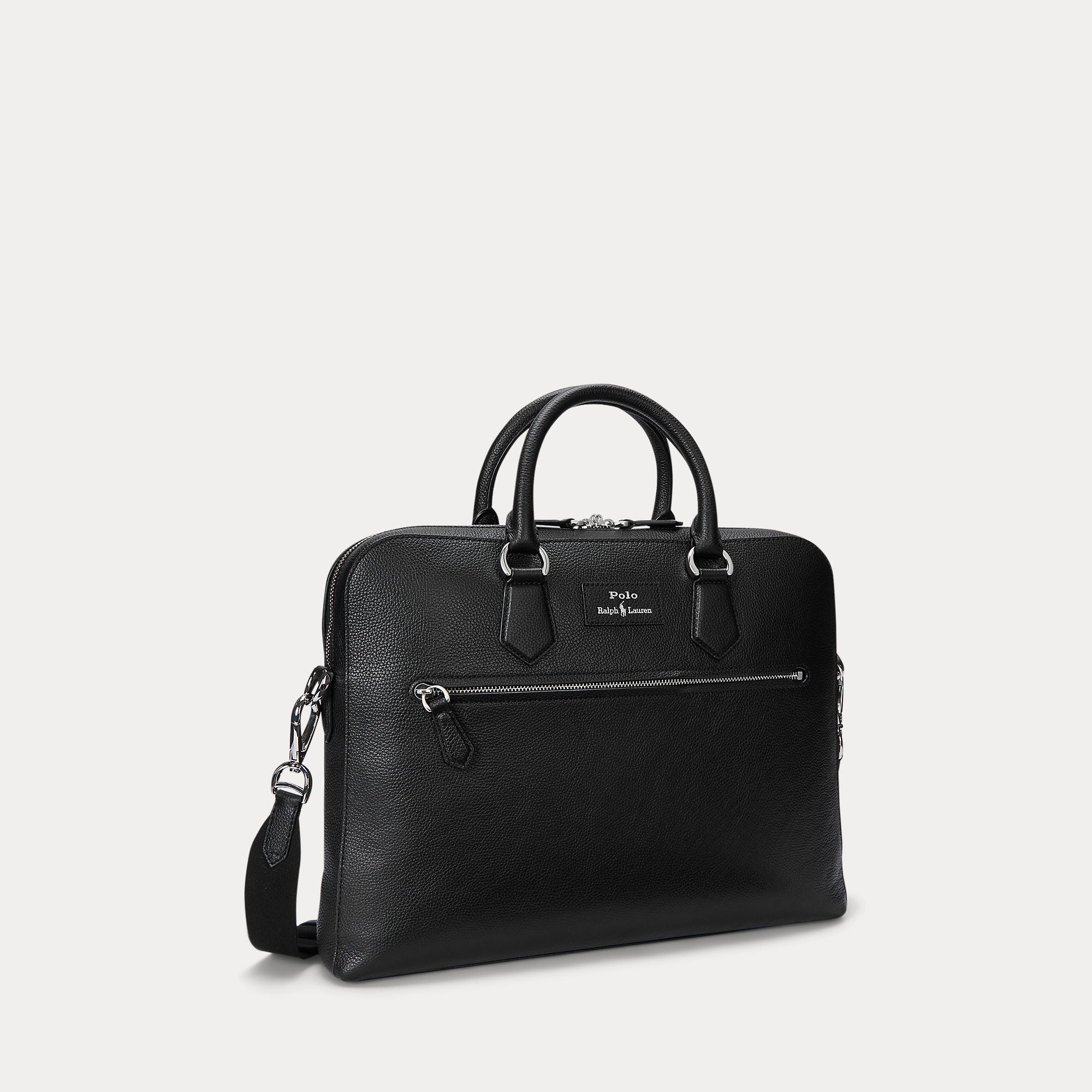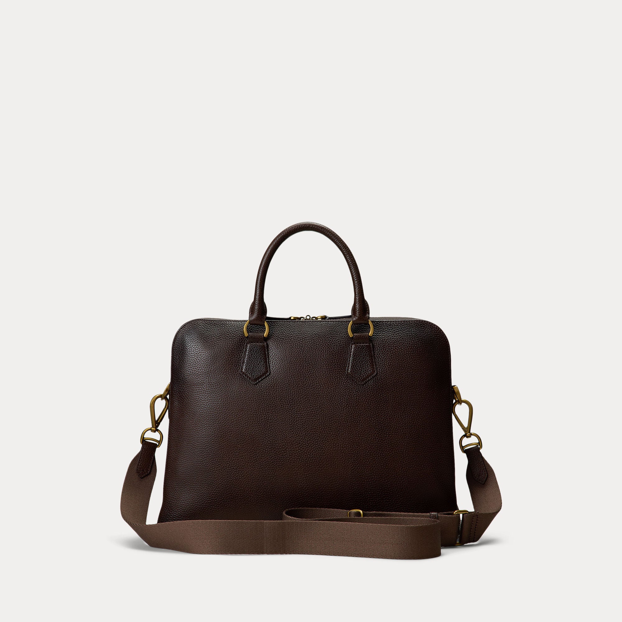 Two leather top handles, each with a 4.25" drop. Removable, adjustable leather-trimmed webbed shoulder strap.Two-way top zip closure with leather zipper pulls.Front zip pocket. Interior padded laptop sleeve with additional zip pocket. Interior slip pockets.“Polo Ralph Lauren” and signature Pony embossed at the front.Reinforced base.Lined with cotton twill.12.25" H x 15.25" L x 2.25" D.Shell: leather. Lining: cotton.Comes with a signature dust bag.