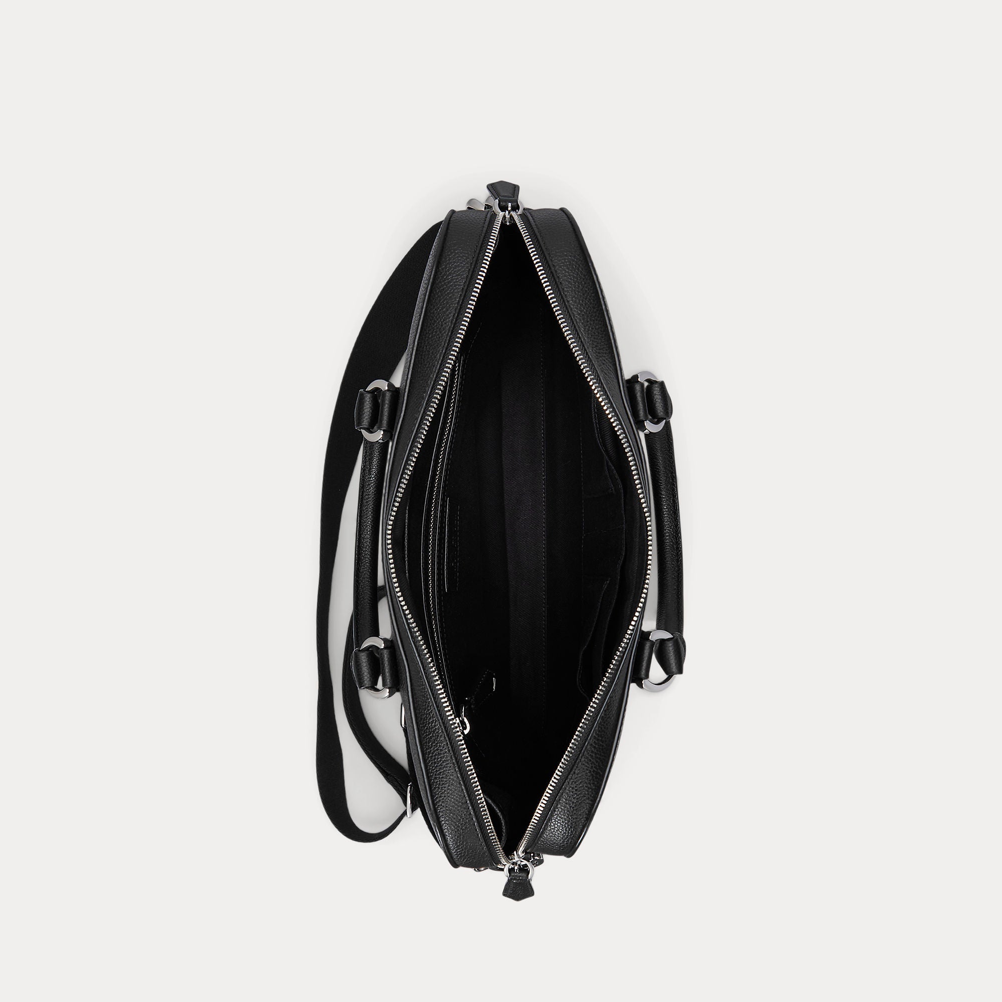 A streamlined silhouette realized in pebbled leather gives this commuter bag a modern look. Embossed at the front with Polo Ralph Lauren’s signature logo, it features multiple pockets, including a padded laptop sleeve, at the interior.