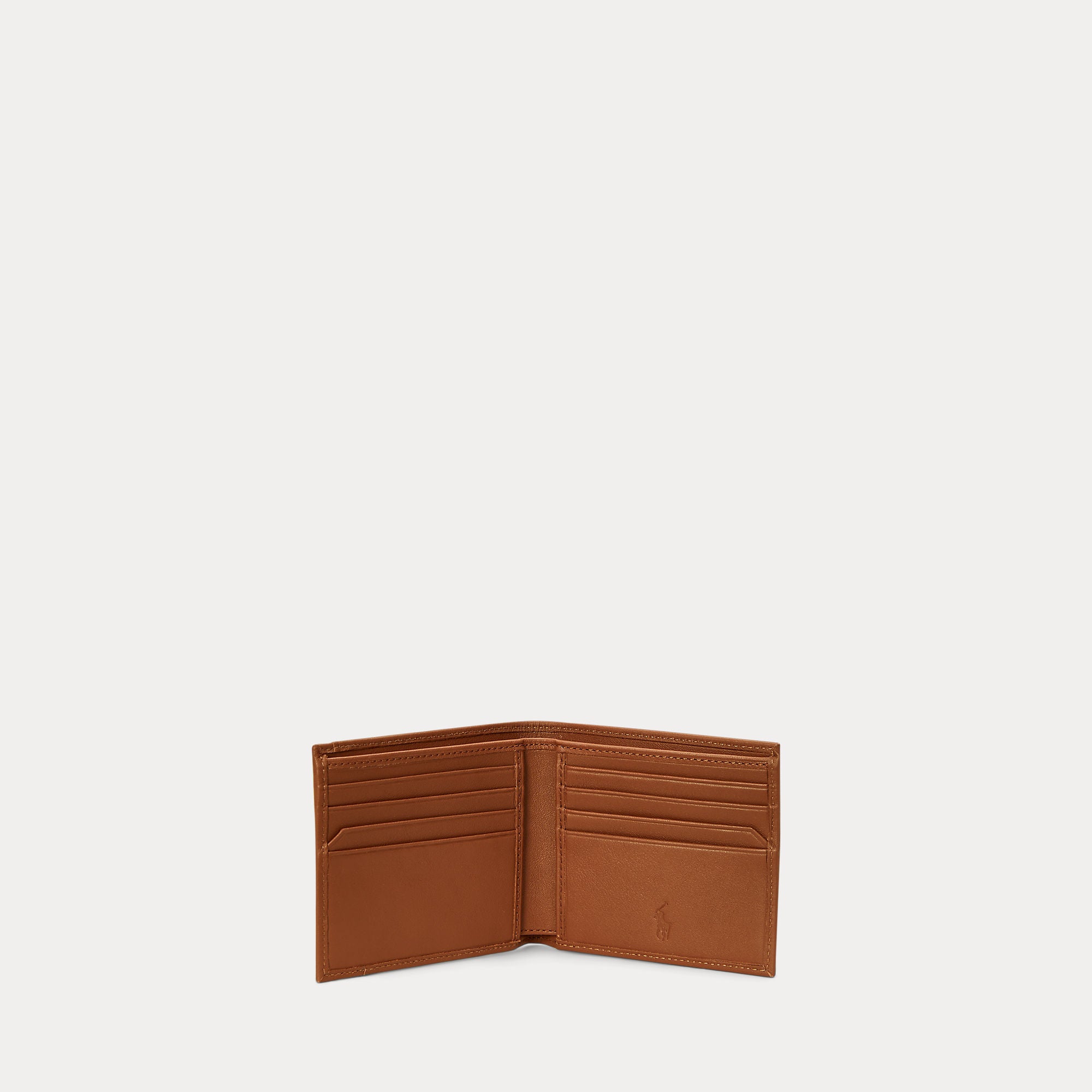 Slim design. Single-needle–stitched edges.Card slot at the front. Eight card slots, one currency pocket, and two slip pockets at the interior.“Polo Ralph Lauren” and signature Pony embossed at the front.Signature Pony debossed at the interior.Pockets are lined with polyester.3.75" H x 4.25" L.Shell: leather. Lining: polyester.Imported.Presented in a signature box.