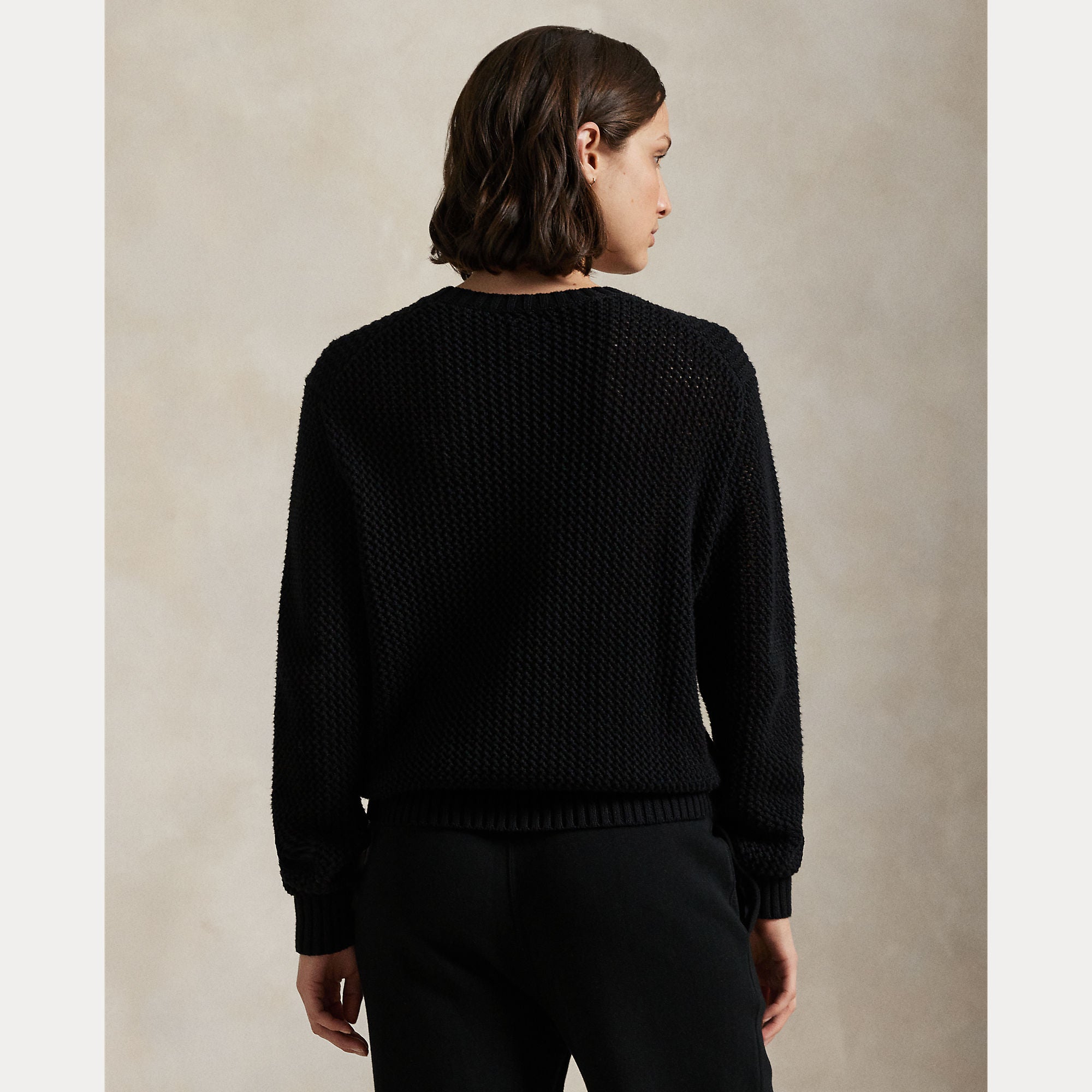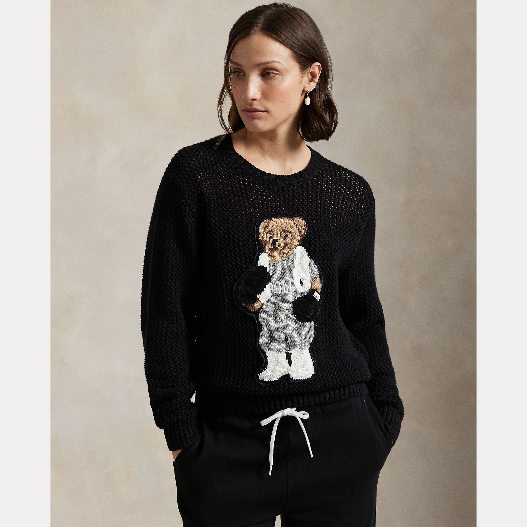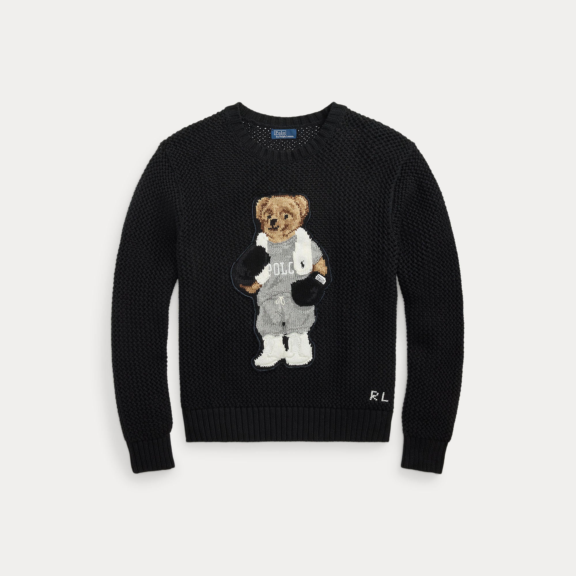 Knit with textural pointelle stitches, this cotton crewneck sweater showcases an intarsia-knit and embroidered rendering of Ralph Lauren’s Polo Bear in a boxer-inspired look.