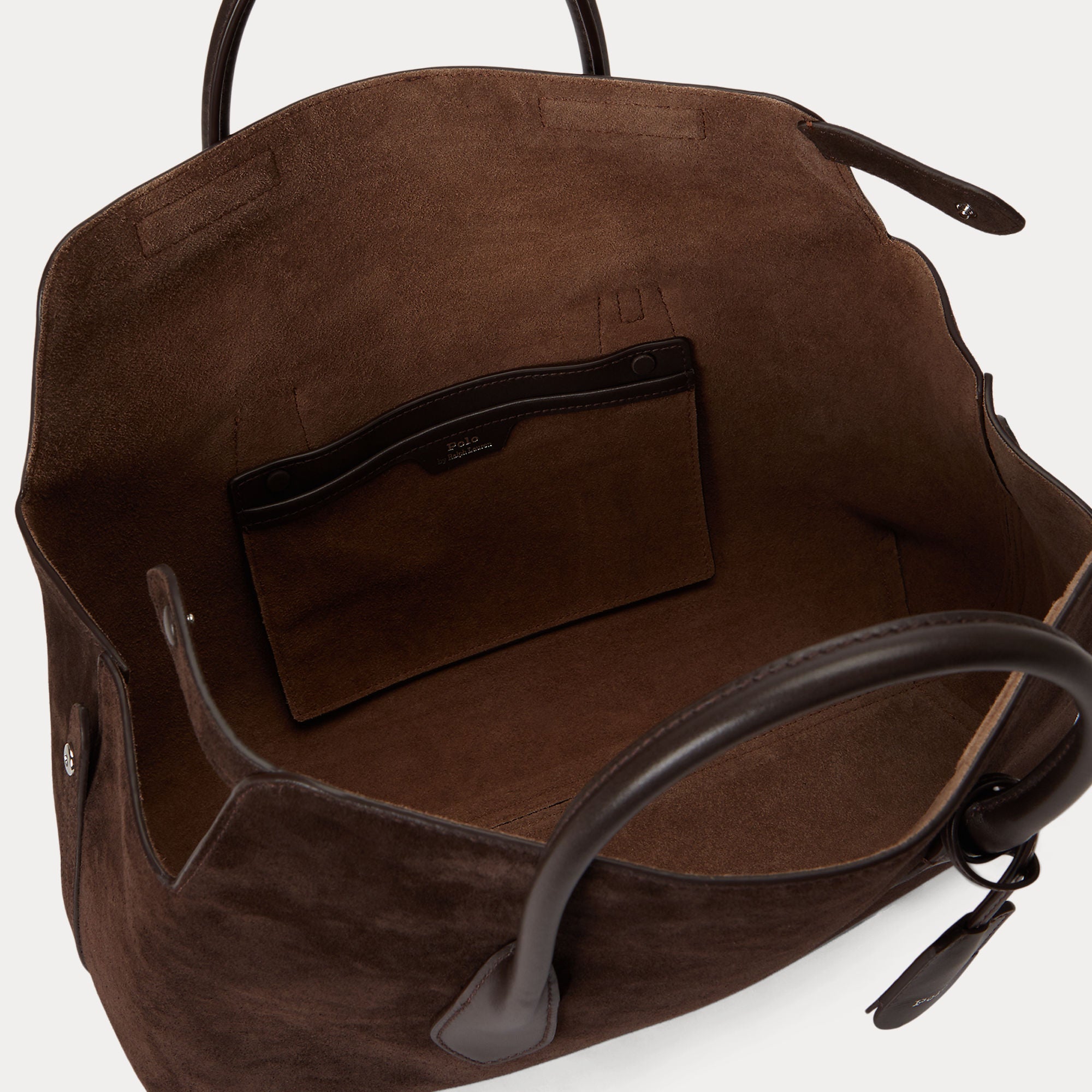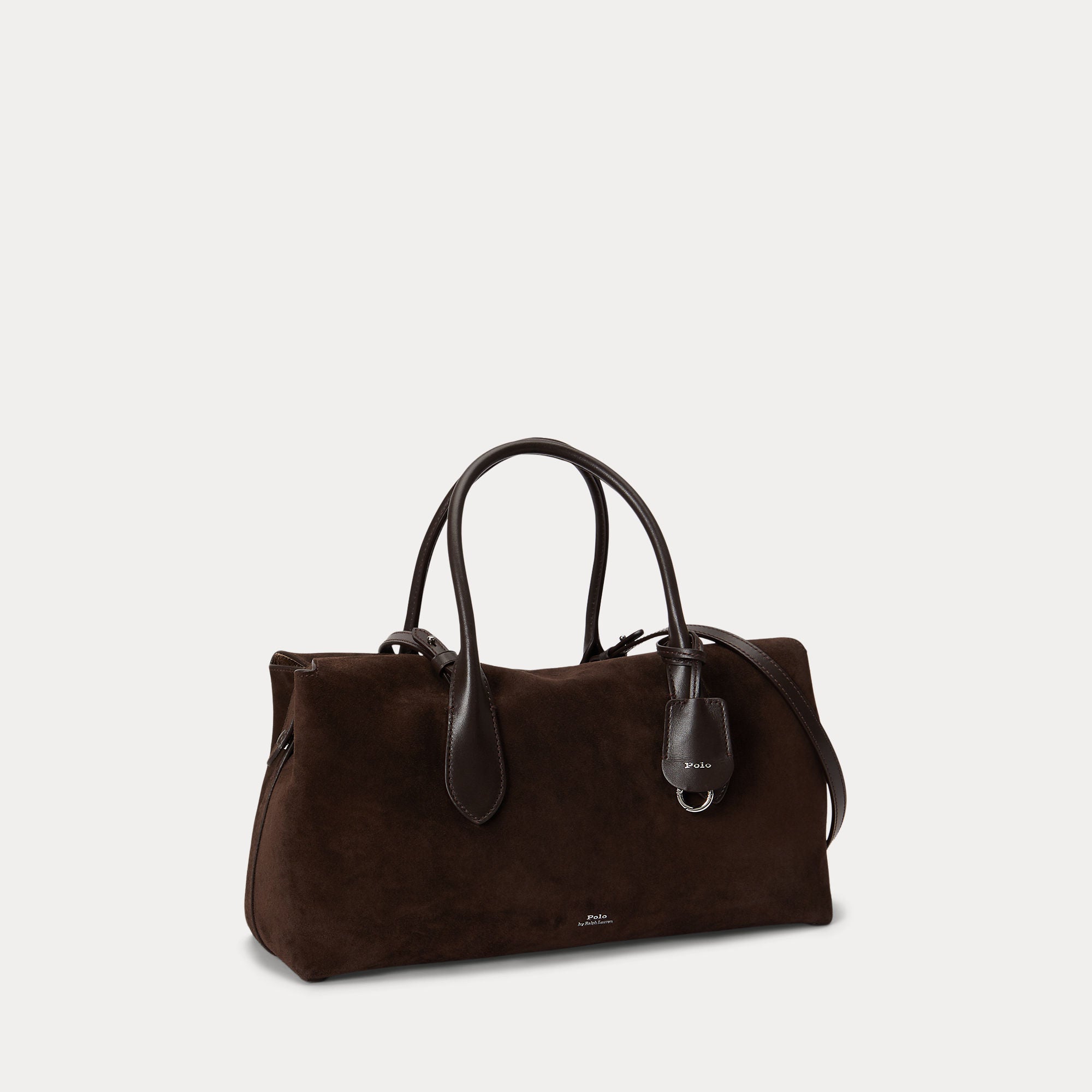 Two tubular top handles with a 5.75" drop. Removable crossbody strap with a 16.75" maximum drop.Overlapping magnetic top closure. Snapped tabs at each side to cinch the bag.Interior slip pocket. Bonded suede interior.“Polo by Ralph Lauren” foil-embossed at the center front. Detachable leather key cover with signature branding and engraved hardware.7" H x 14" L x 5.5" D.Leather.Imported.Coloring may rub off onto fabrics and upholstery.Includes a dust bag.