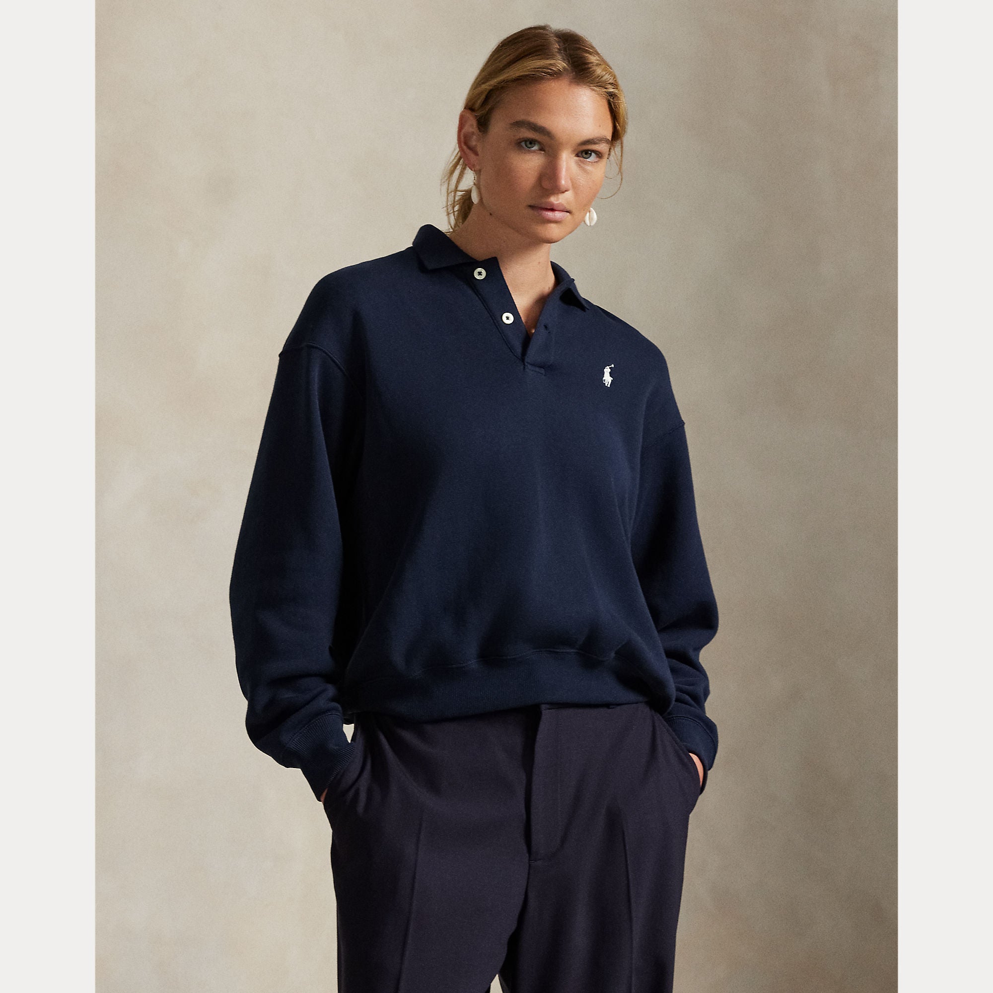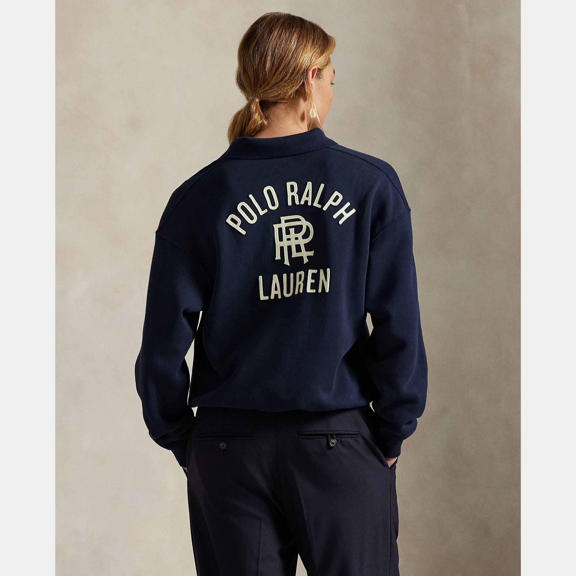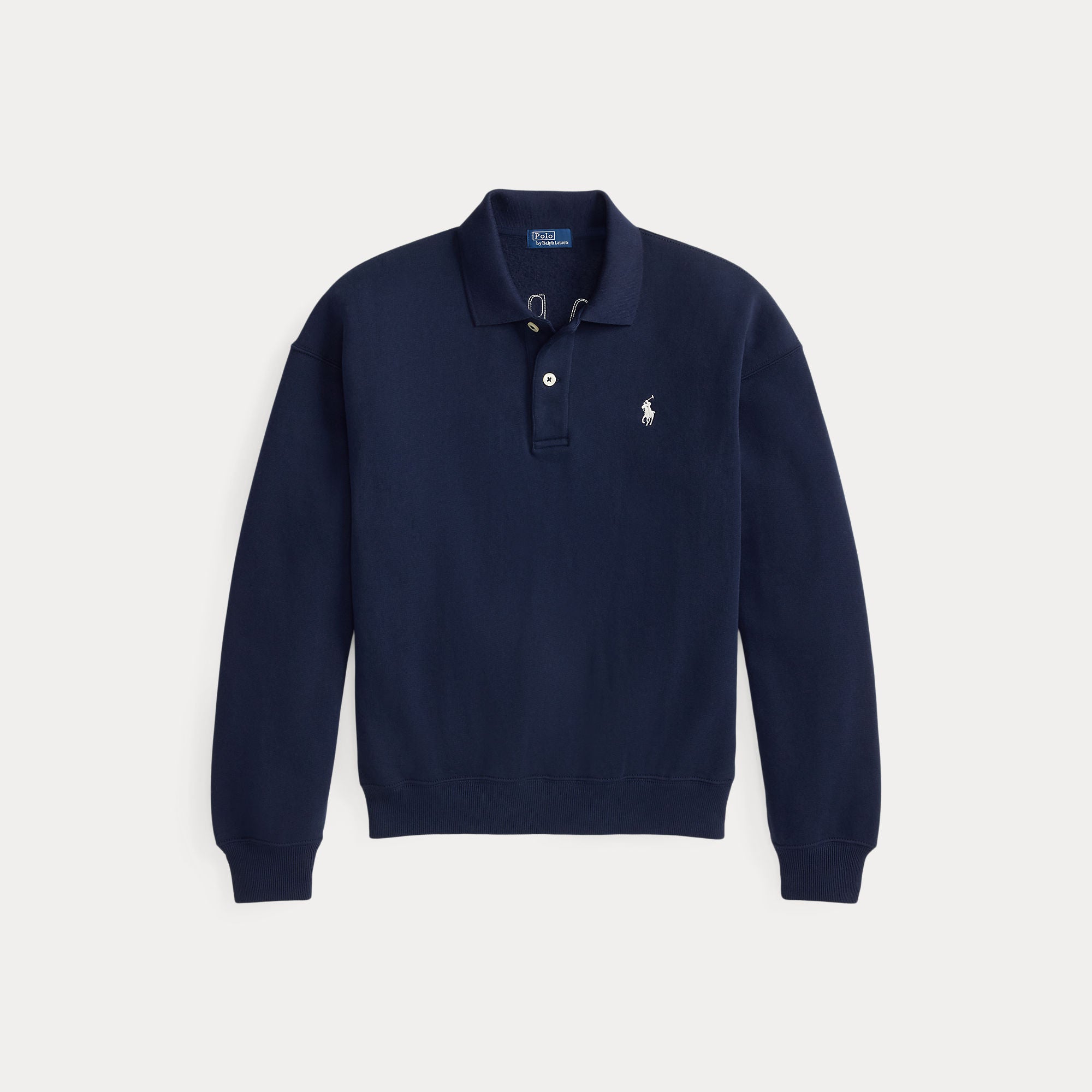 Merging a classic Polo collar and placket with a relaxed pullover silhouette, this fleece layer is decorated with appliquéd felt patches that spell our signature logo across the back.