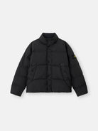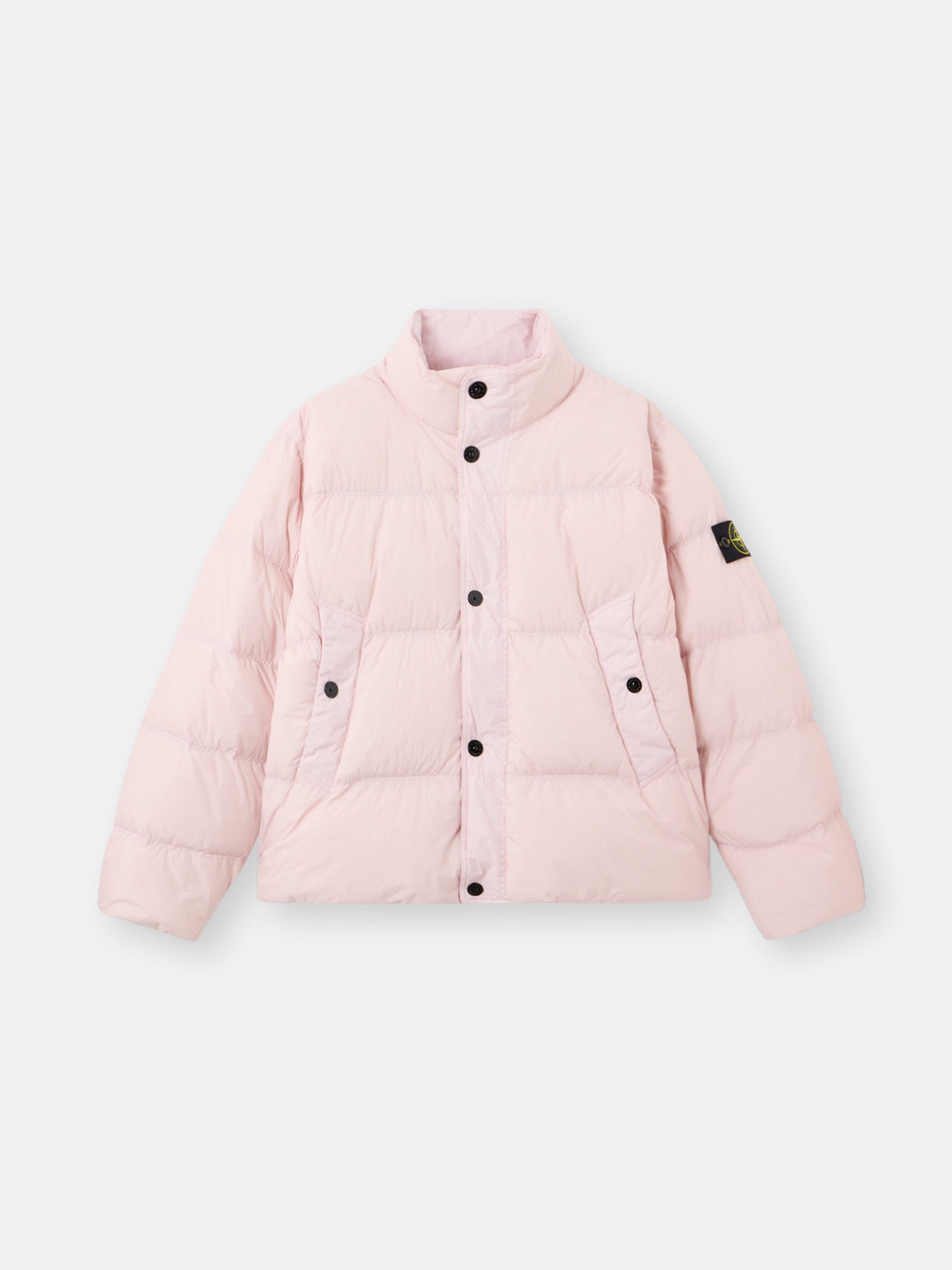 Down jacket in a light recycled nylon rep with an ultra-tight weaving construction. The resin coating of its inner face makes it wind resistant and mildly water resistant. Due to the resin treating of the material, the colour penetrates unevenly into the material, lending a crinkled appearance to the surface. The piece is padded with the finest feathers specifically treated to withstand the garment dyeing procedure. RDS - Responsible Down Standard certified.