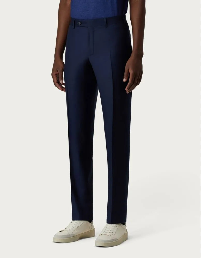 Neat lines enhance the elegance of this pure wool suit, defined by the comfort of the regular fit. Consisting of a single-breasted jacket and pants with a practical, dartless design, it has been created for the businessman who likes to stand out with his style choices.