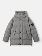 Hooded down parka in a light recycled nylon rep with an ultra-tight weaving construction. The resin coating of its inner face makes it wind resistant and mildly water resistant. Due to the resin treating of the material, the colour penetrates unevenly into the material, lending a crinkled appearance to the surface. The piece is padded with the finest feathers specifically treated to withstand the garment dyeing procedure. RDS - Responsible Down Standard certified.