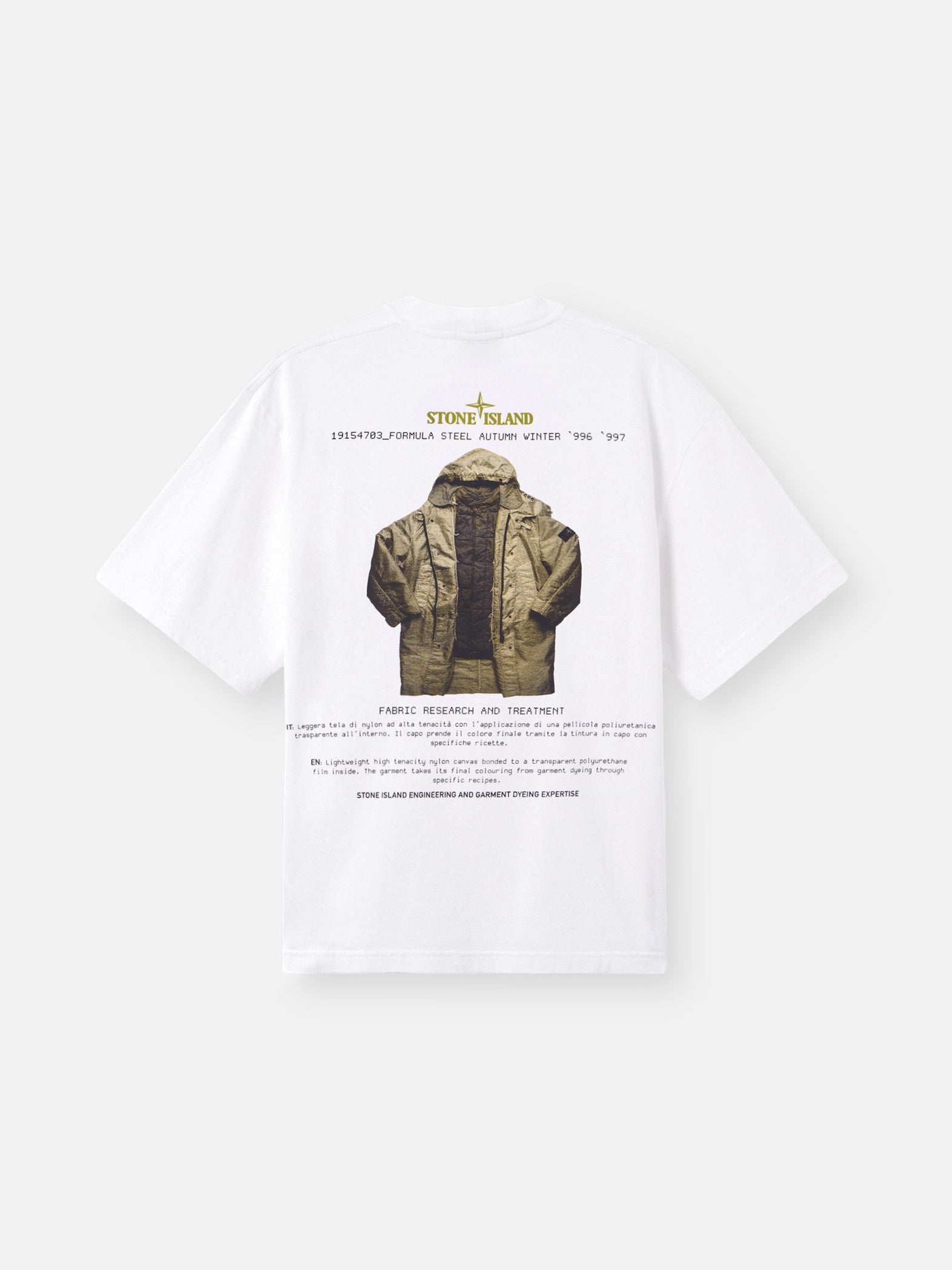 Archivio is a project that illustrates Stone Island's textile experimentation and innovation. This method of research has been known as a lodestar in the fashion and design world for nearly forty years. Every season, a new ‘Archivio’ print tells the story of a fabric that has become a symbol of this passionate research. A window on the tag attached to the garment holds a sample of the fabric. Short-sleeve T-shirt in organic cotton jersey with ‘Archivio’ print. Garment dyed.