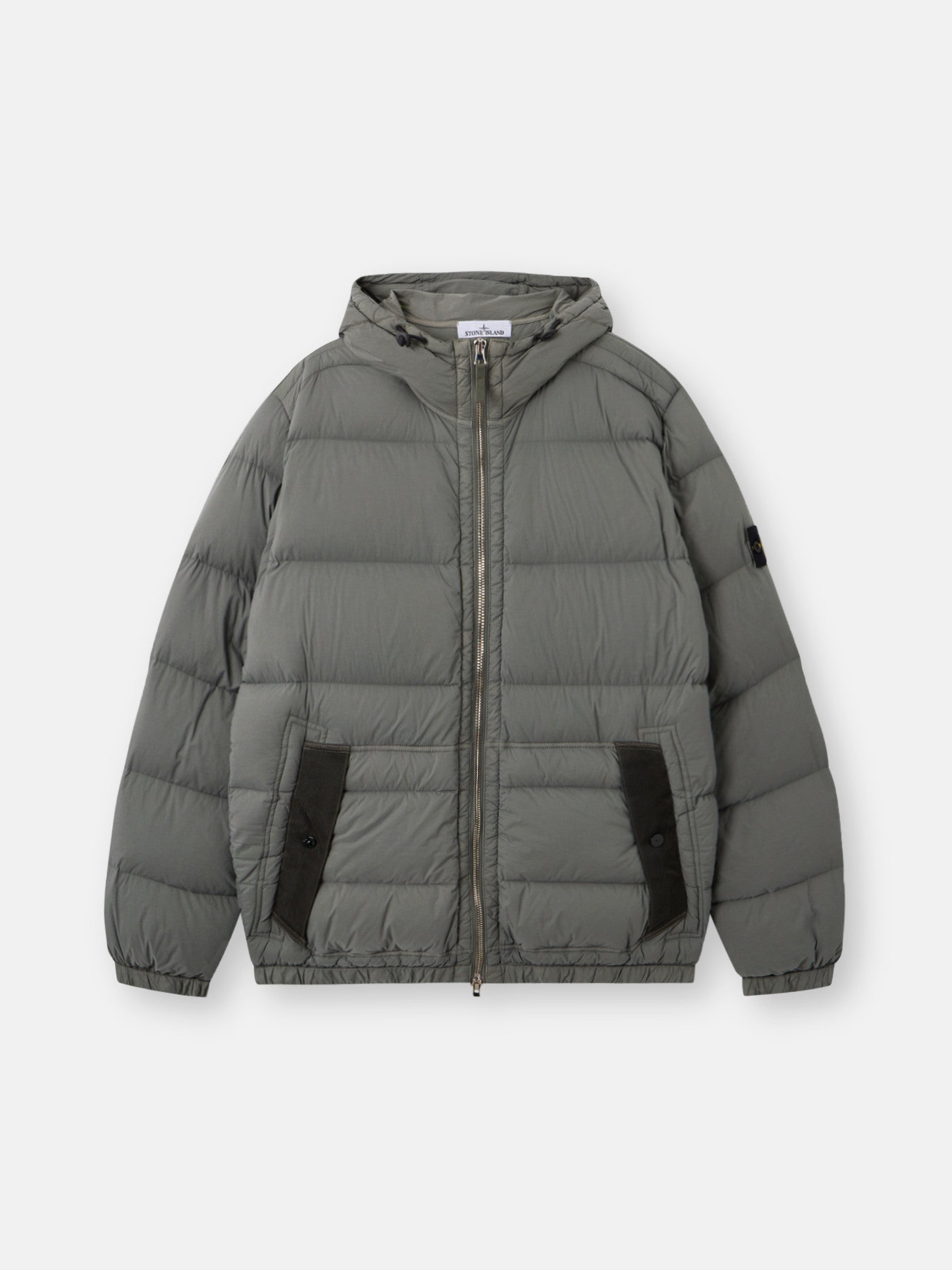 Hooded down jacket in a light stretch nylon single layer fabric undergoing a special weaving technique automatically creating the feather compartments directly from the loom. The seamless feather tunnels substantially increase the hold of the down. The finished garment is padded with direct injection with the finest feathers, specifically treated to resist garment dyeing. Garment dyed with the addition of a special anti-drop agent. RDS - Responsible Down Standard certified.