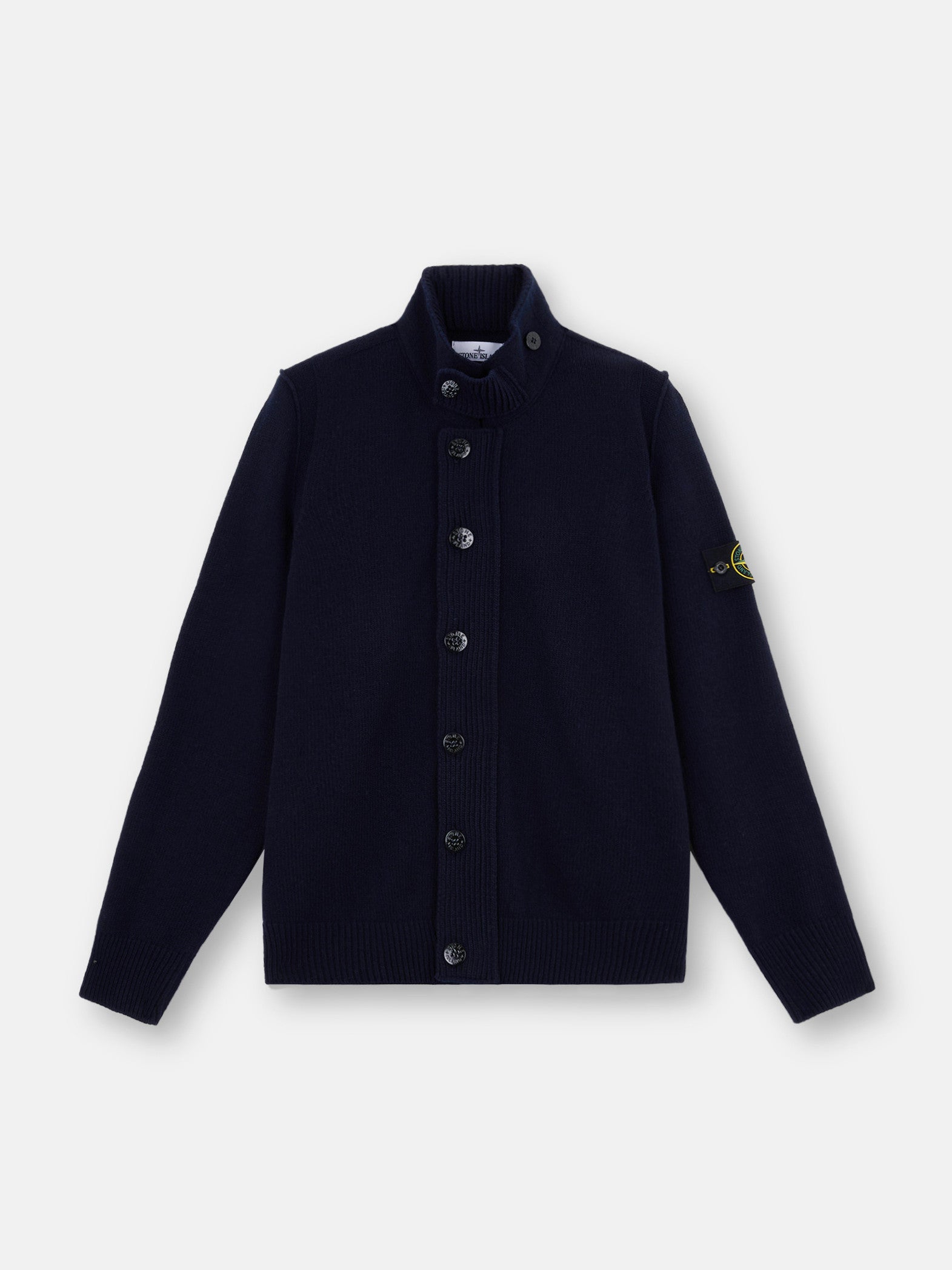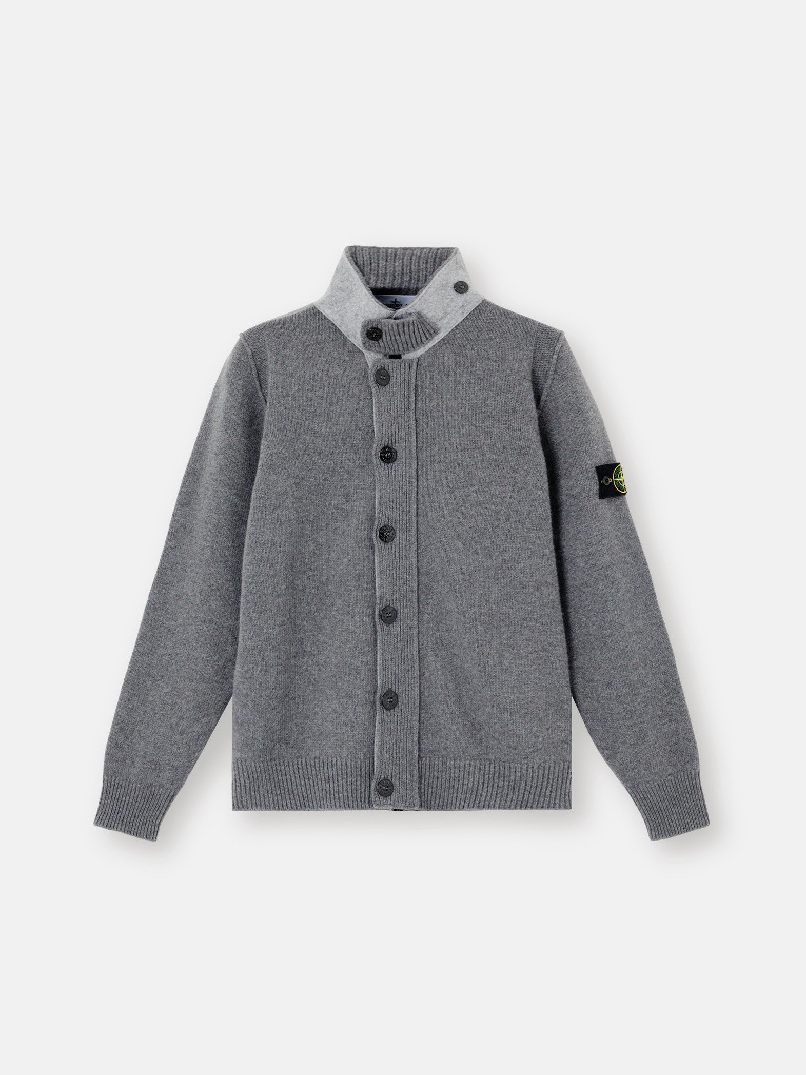 Knit button-up jumper in lamb wool and nylon blend. Stocking stitch. Gauge 7.