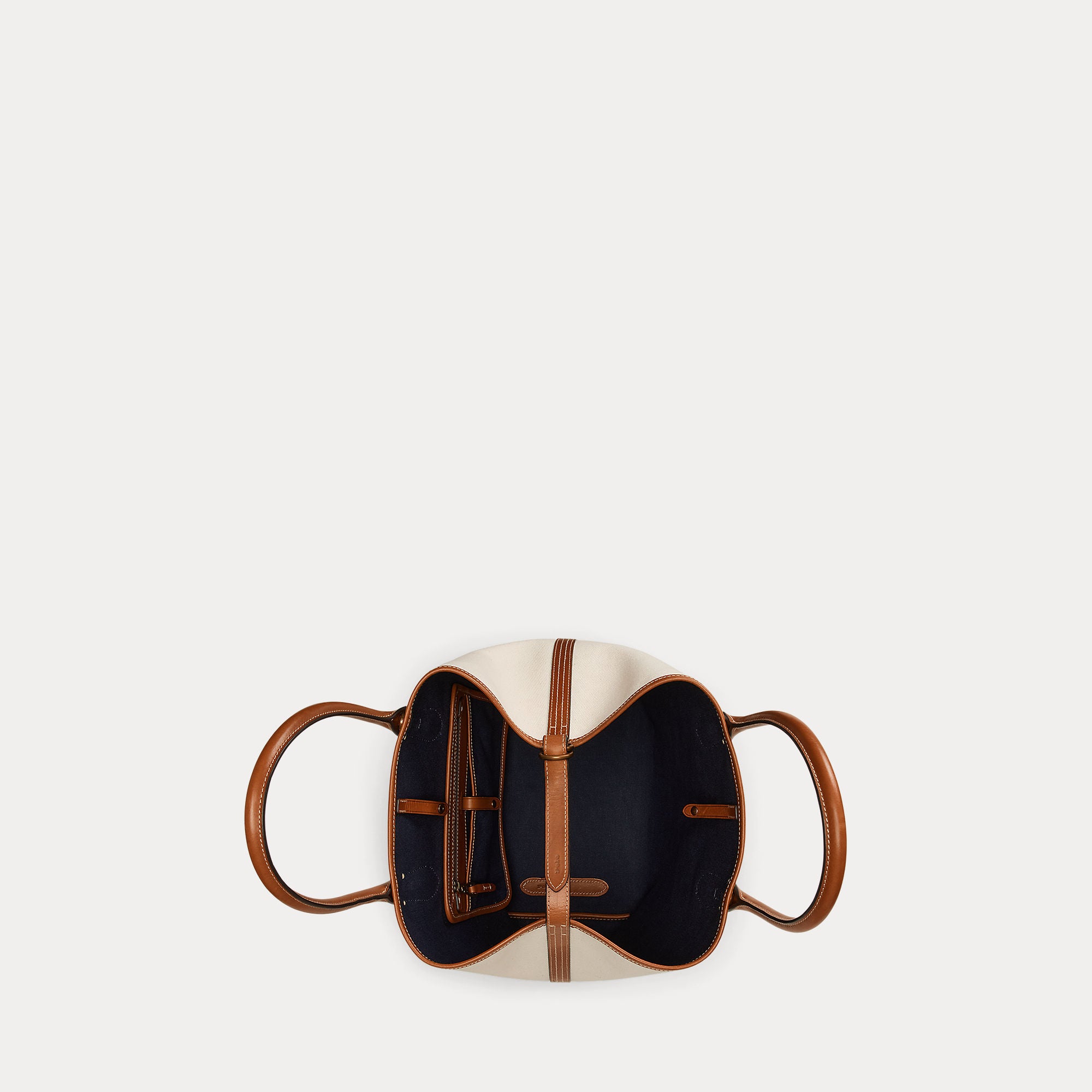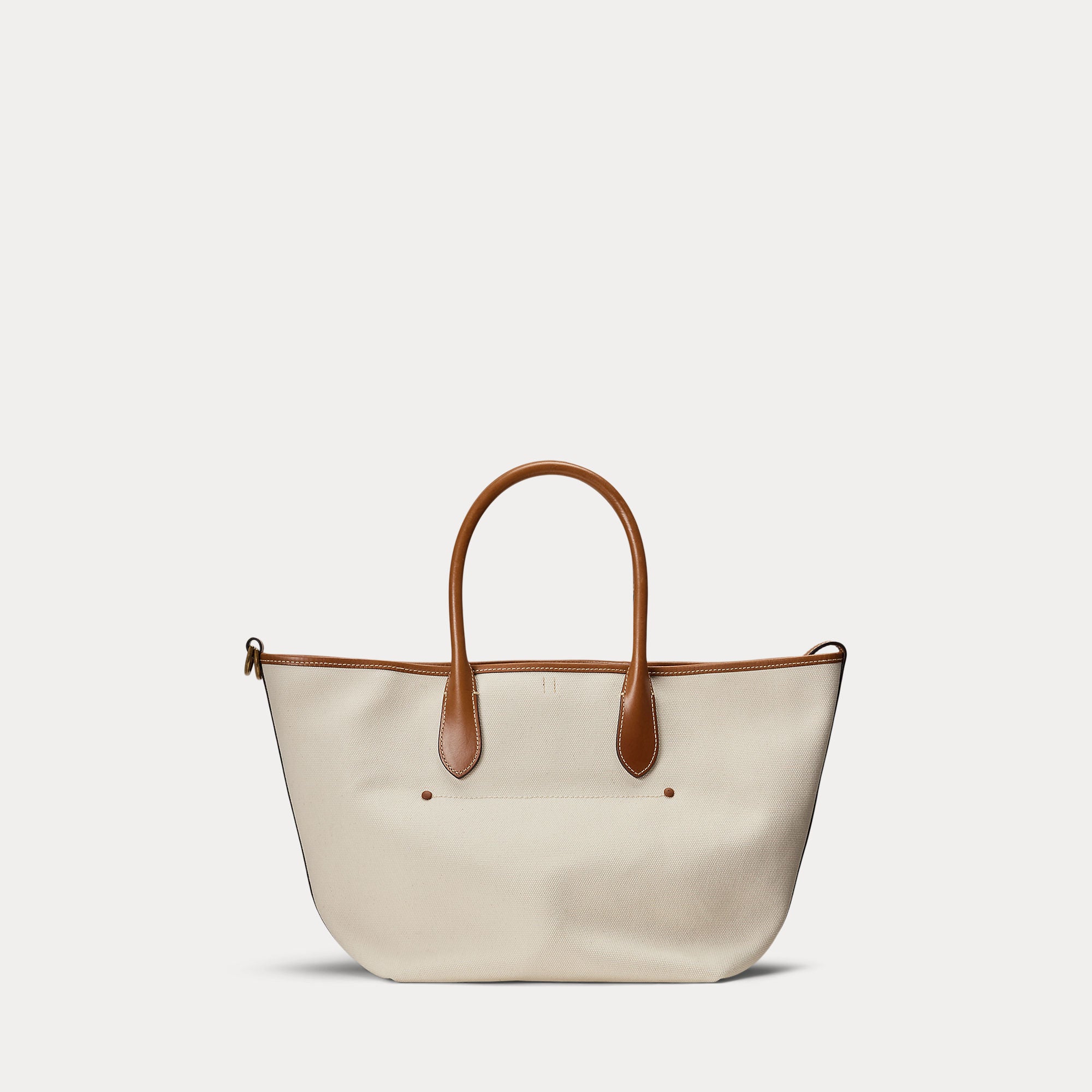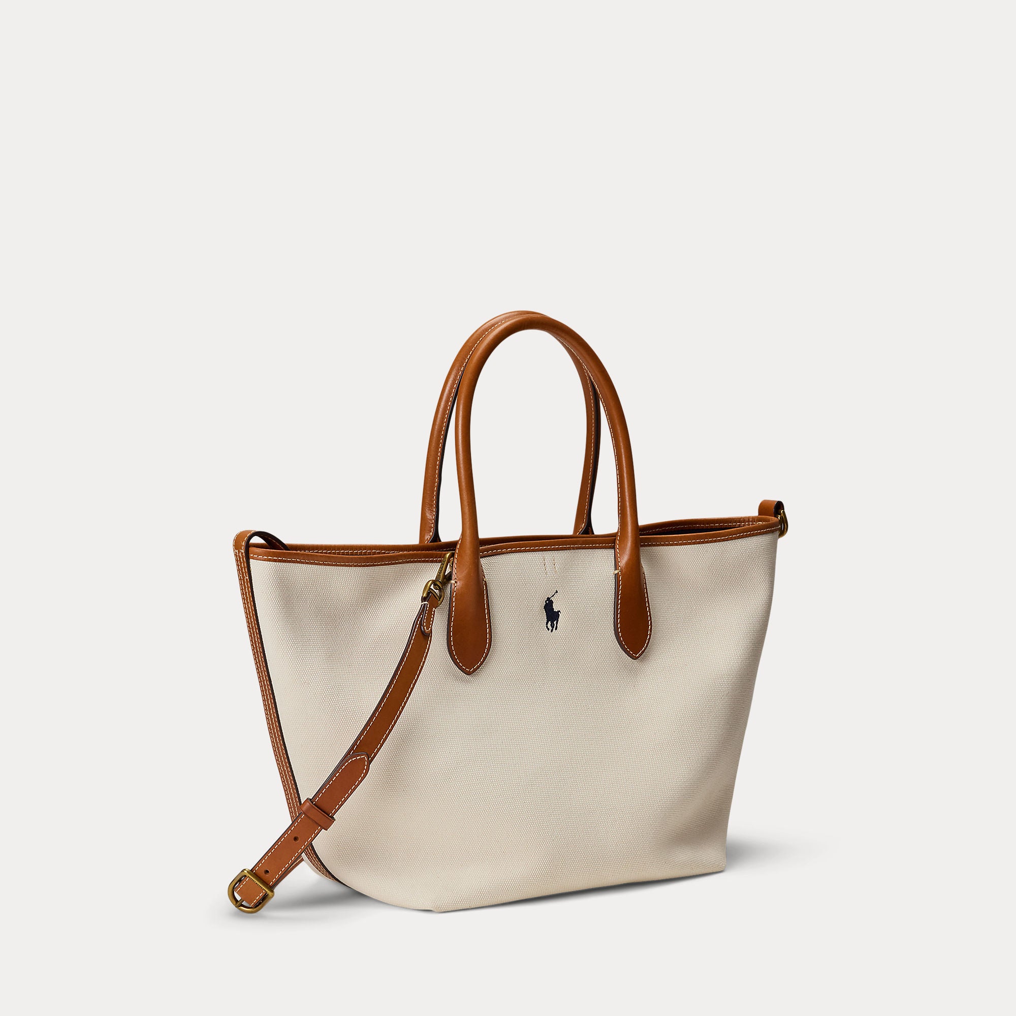 Featuring signature metal hardware that recalls Polo’s equestrian heritage, this medium tote bag is rendered in durable canvas and trimmed with full-grain leather. Designed with versatility in mind, this spacious bag delivers two looks in one: a classic tote silhouette and a trapezoid-shaped silhouette, which is achieved by looping the leather strap at the top right through the D-ring at the top left.
