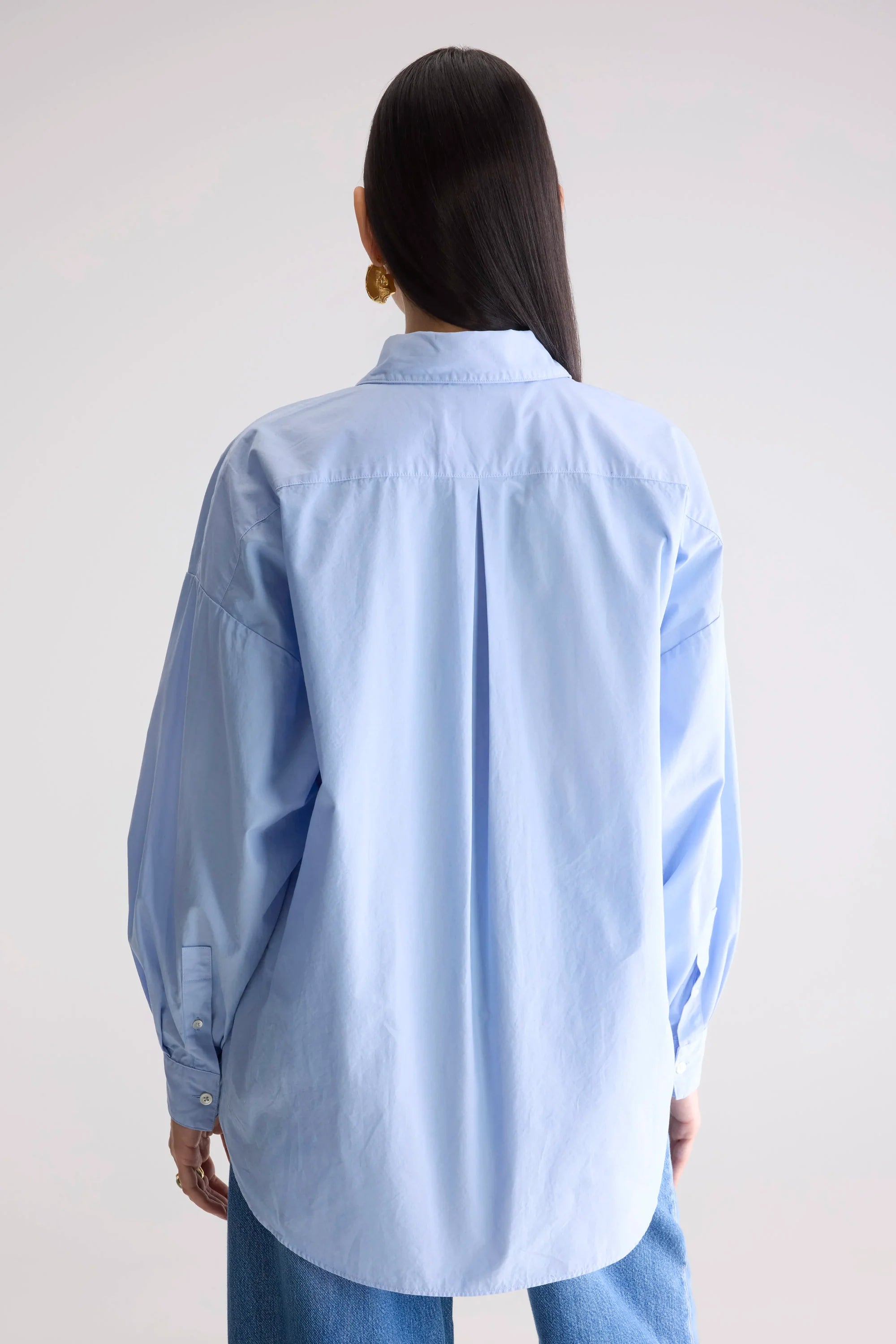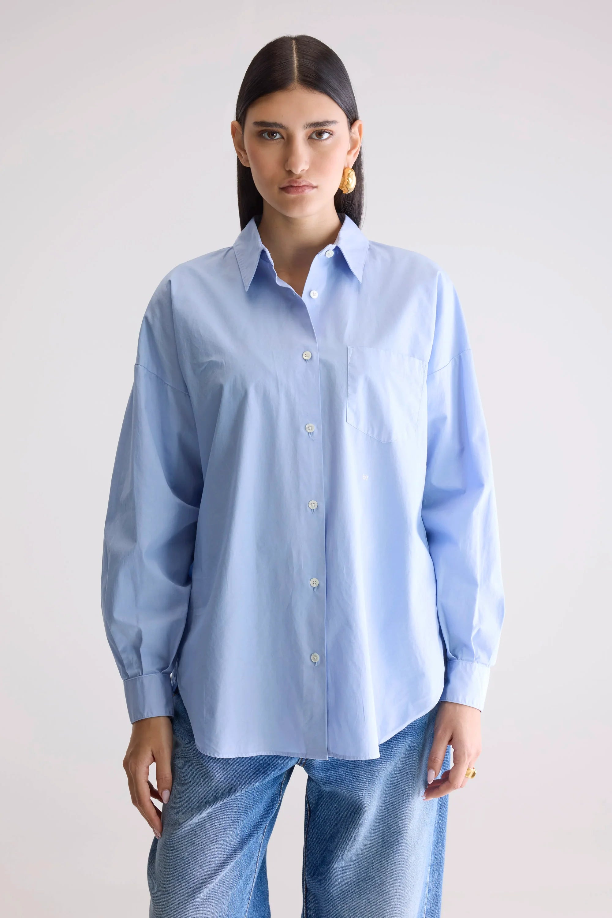 Oversized button-up shirt with long sleeves, a shirt collar and patched front pocket, made from light blue cotton poplin.
