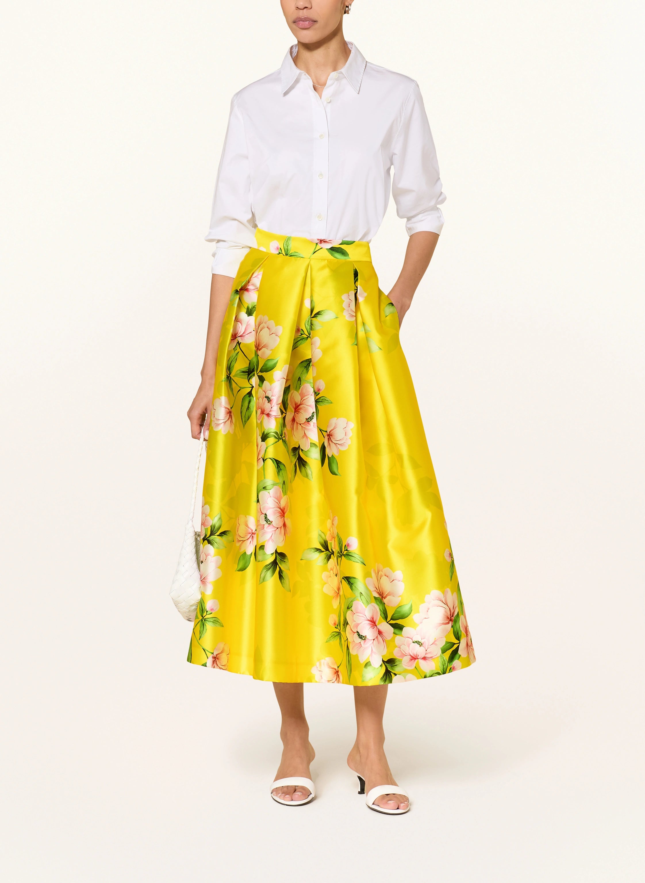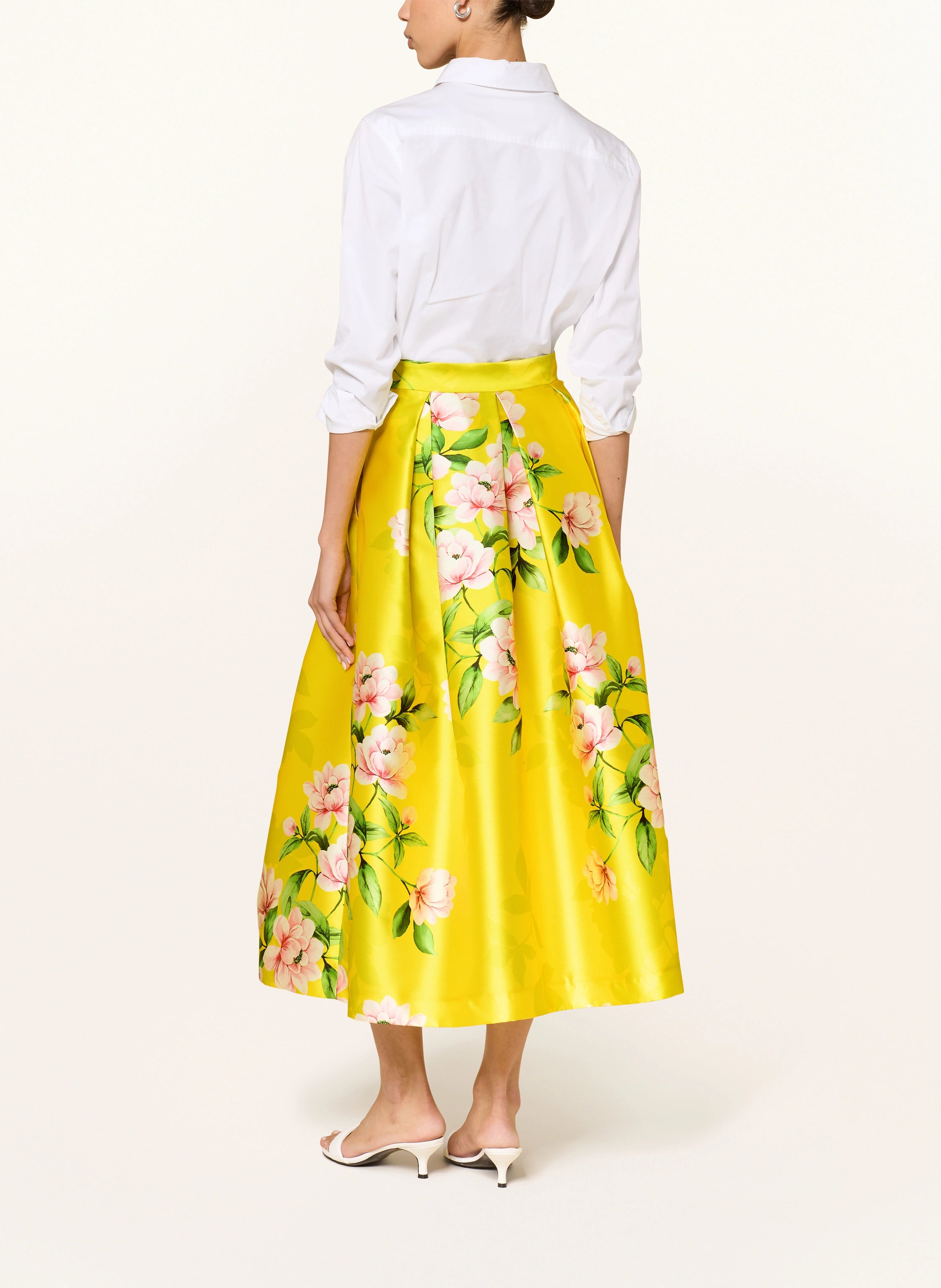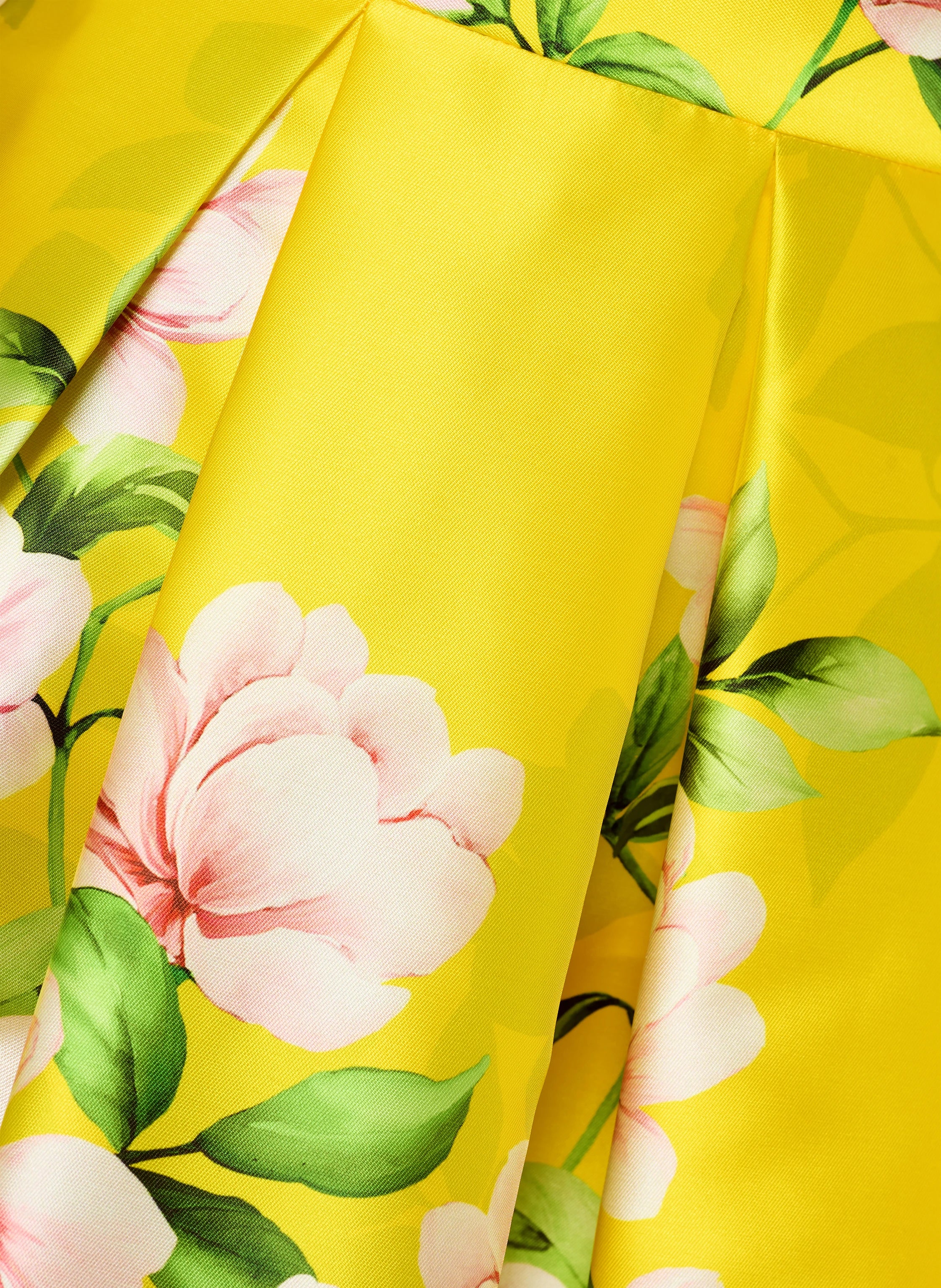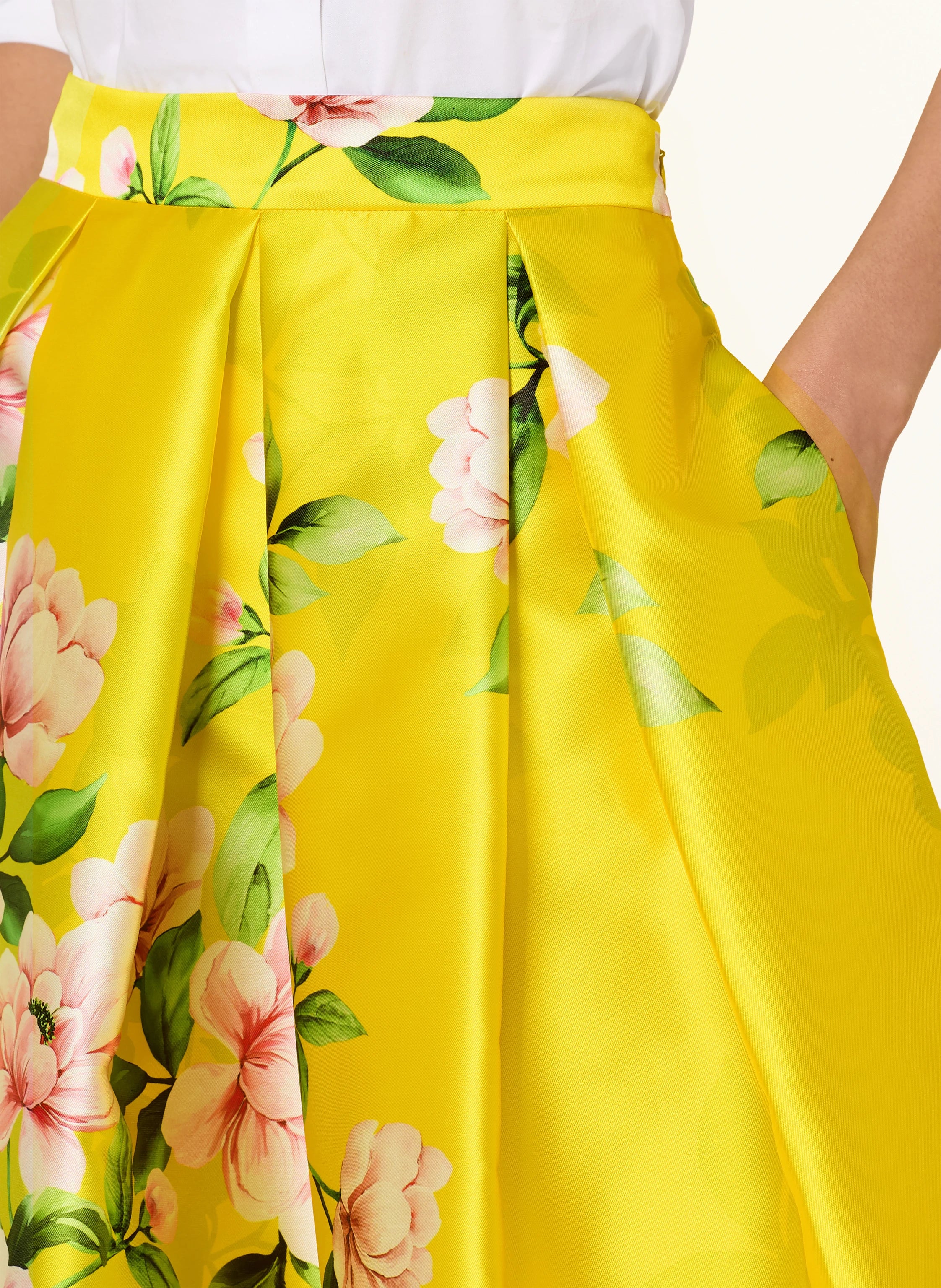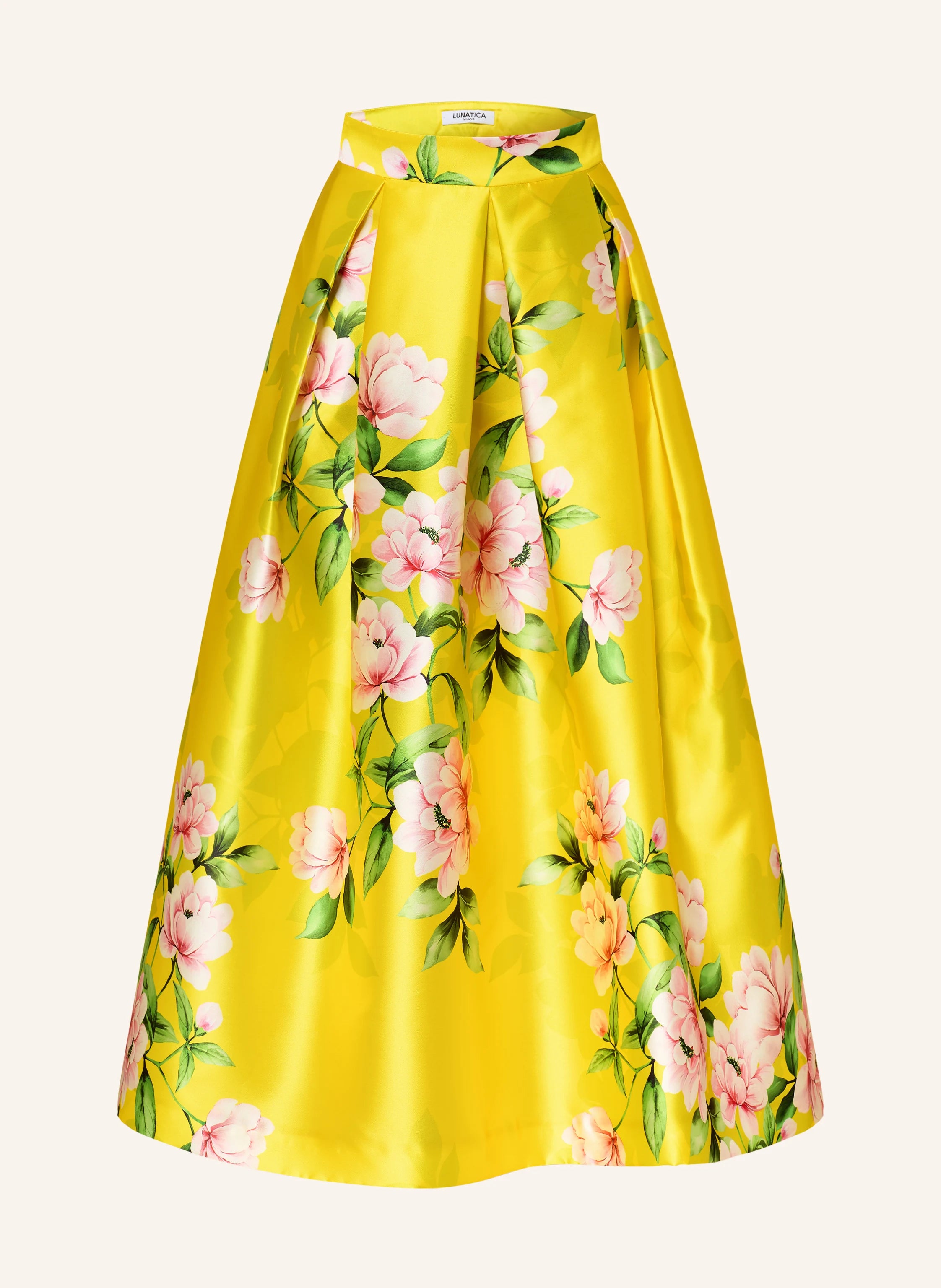 Crafted in Italy, this piece features a lustrous satin finish that catches the light with every movement. The smooth texture is enhanced by meticulous pleating, which adds sophisticated volume and a rhythmic flow to the flared cut. The vibrant floral print serves as a bold focal point, grounded by the refined quality of Italian craftsmanship.