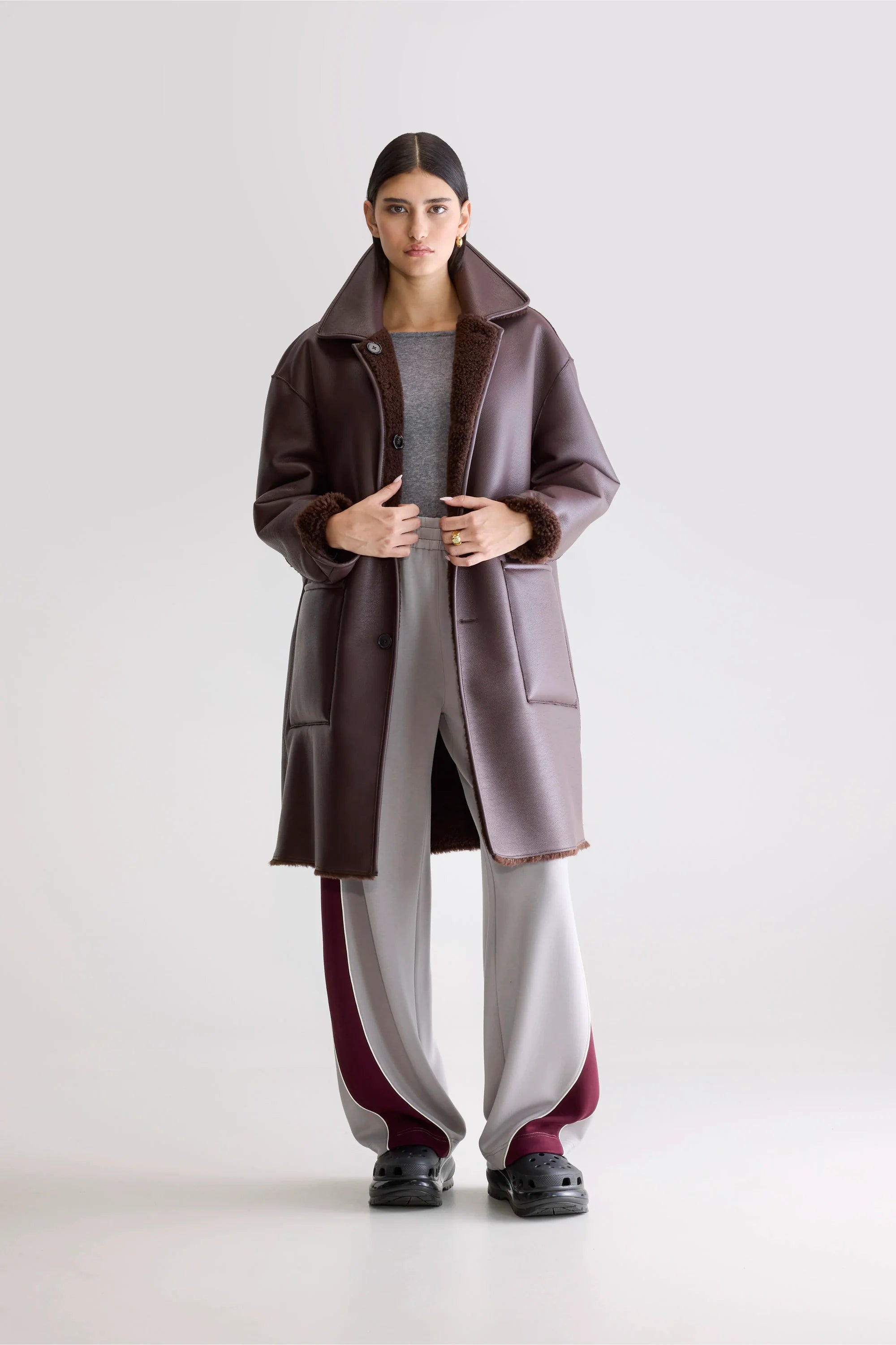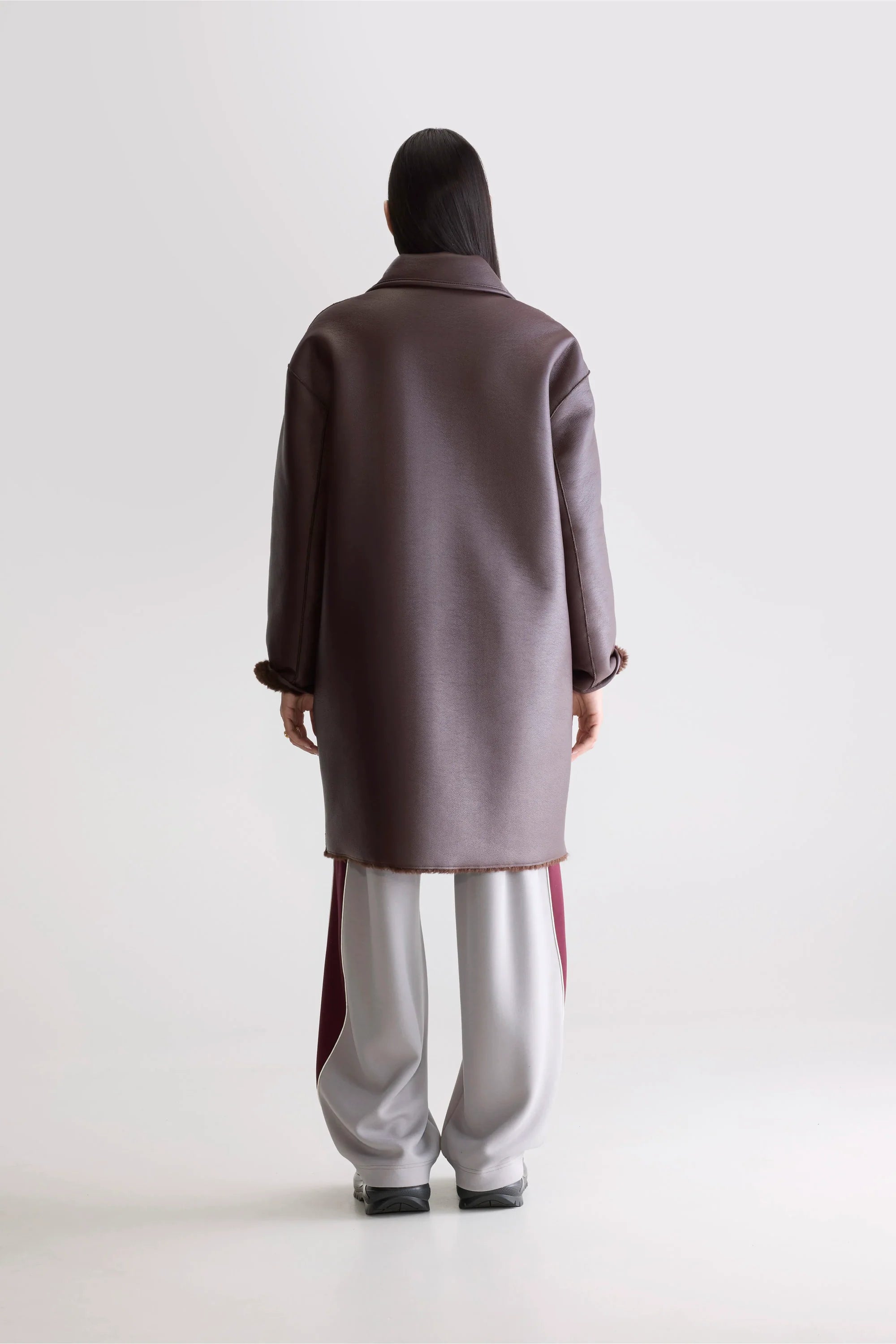 Reversible long faux fur coat in dark chocolate, with one side in teddy and the other in faux leather.