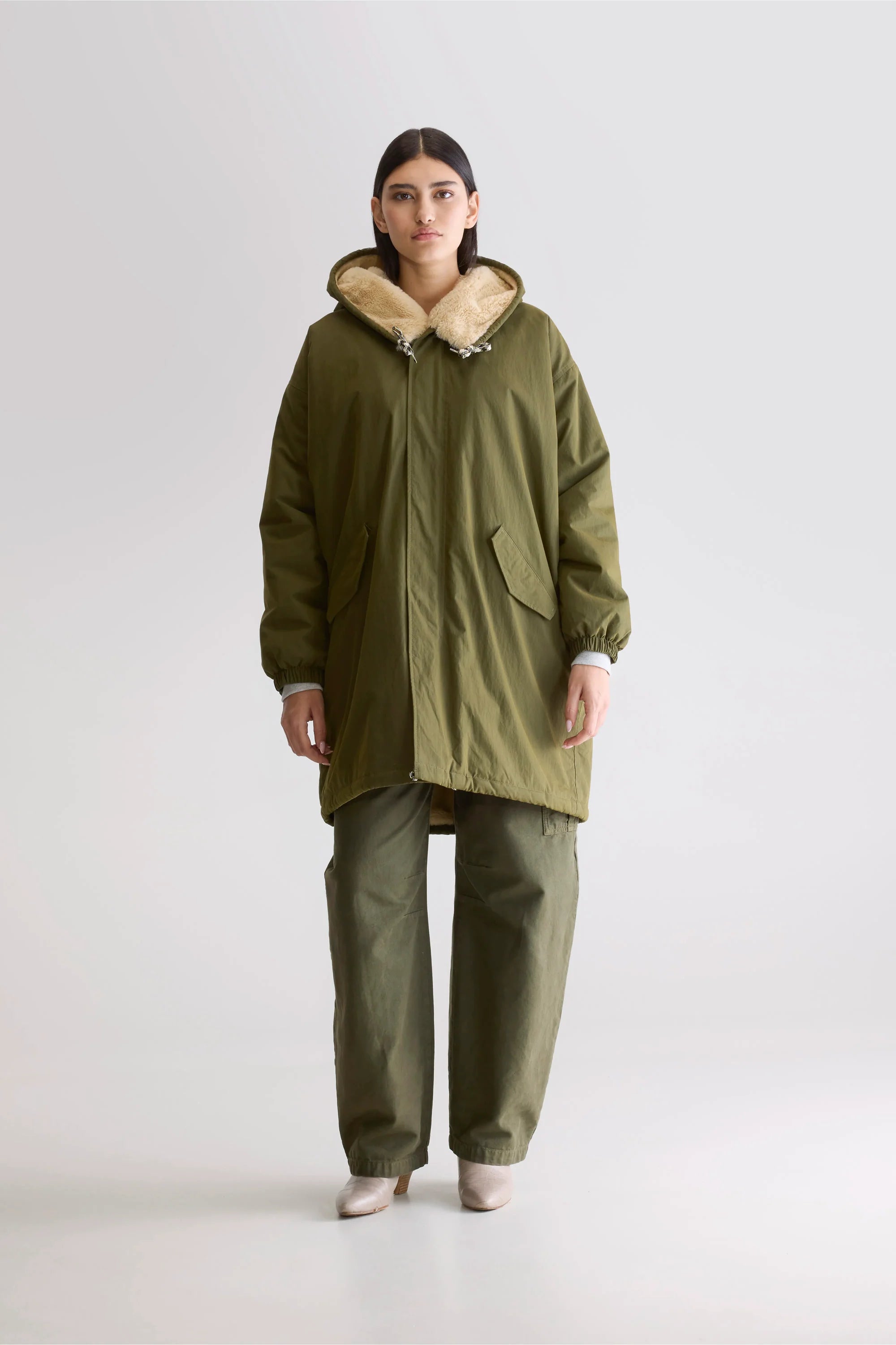 Oversized hooded parka in dark blue canvas with raglan sleeves and elastic hems and lined with ecru faux-fur.