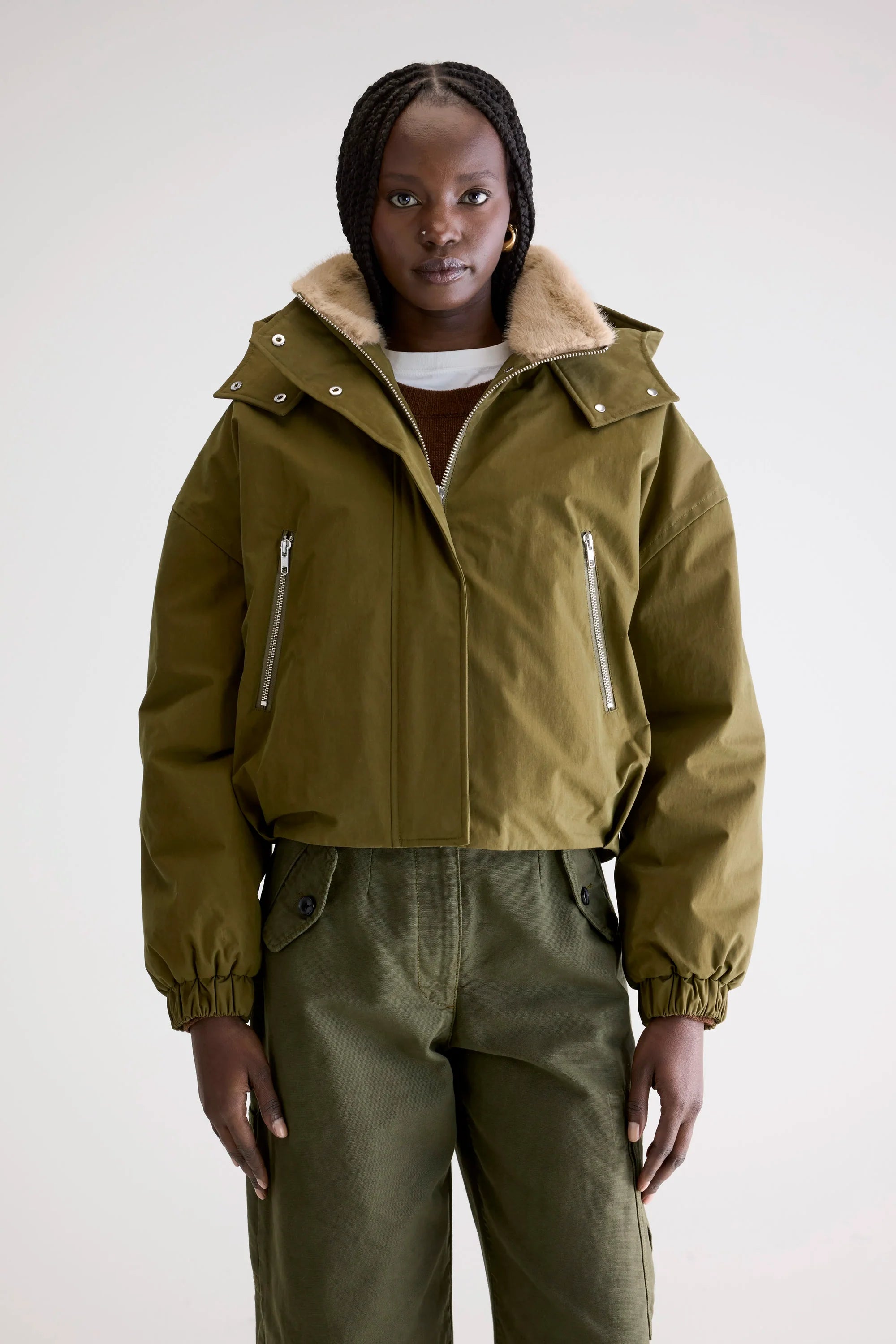 Cropped green bomber jacket with faux fur lining, a zip-up and snap button front closure, a raised collar topped with a hood, and fitted cuffs and hem.