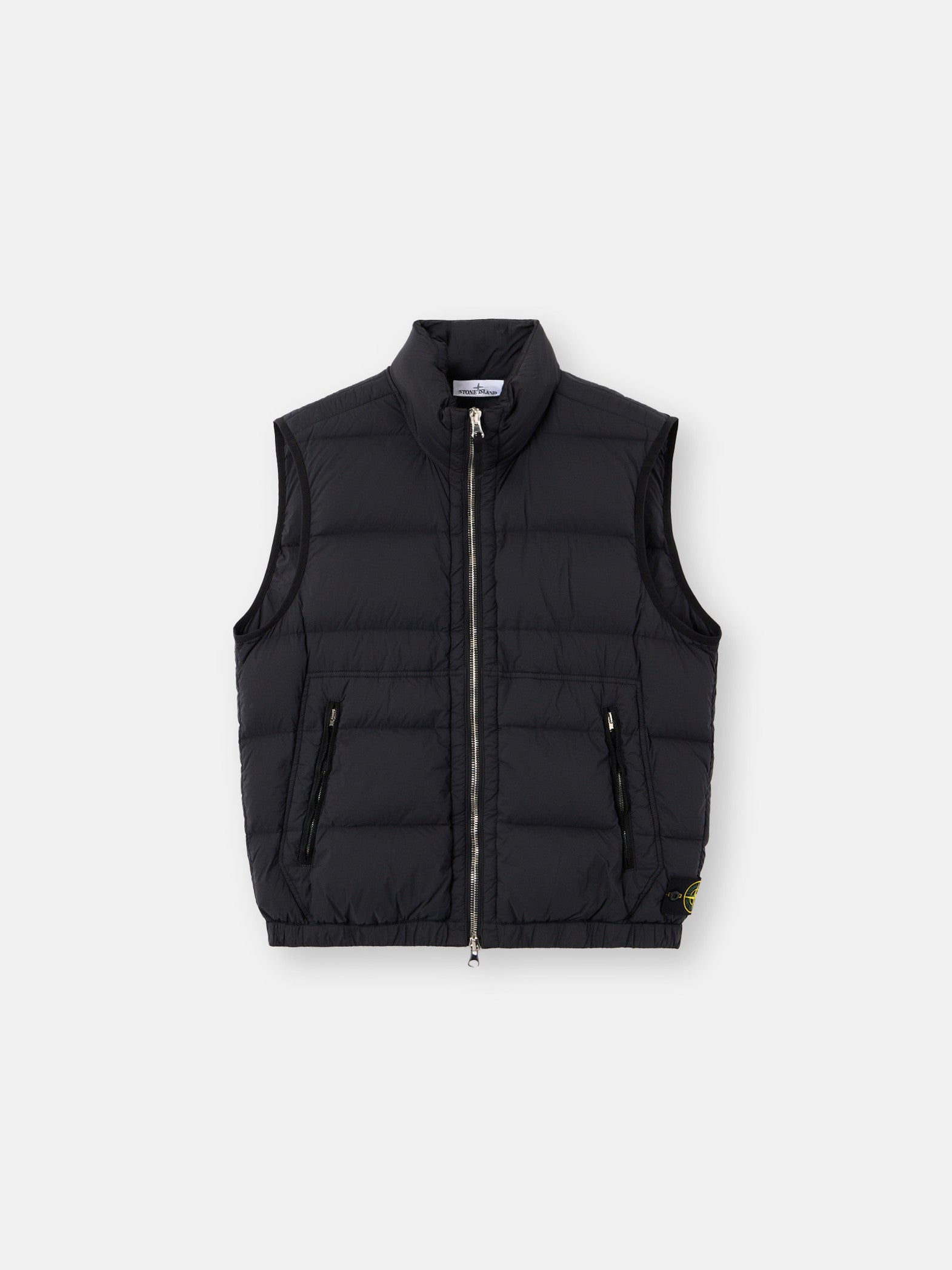 Down vest in a light stretch nylon single layer fabric undergoing a special weaving technique automatically creating the feather compartments directly from the loom. The seamless feather tunnels substantially increase the hold of the down. The finished garment is padded with direct injection with the finest feathers, specifically treated to resist garment dyeing. Garment dyed with the addition of a special anti-drop agent. RDS - Responsible Down Standard certified.